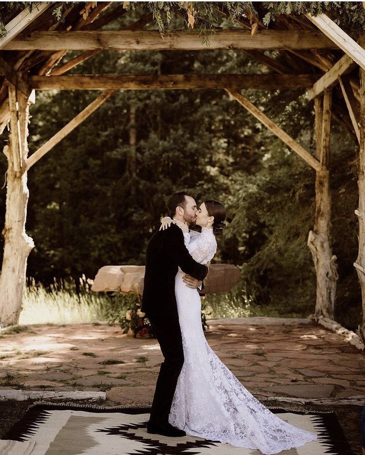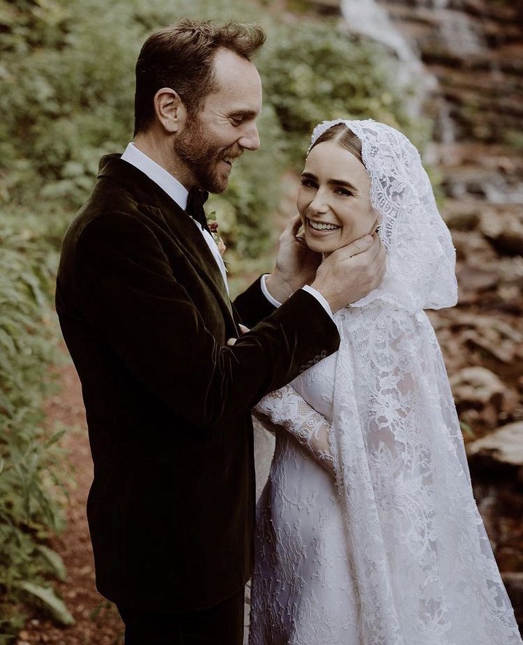 На мен лично с този воал на главата и шлейфа от дантела (сватбената рокля на Лили) ми идва в повече. Все едно е наметнала едновремешно перде.