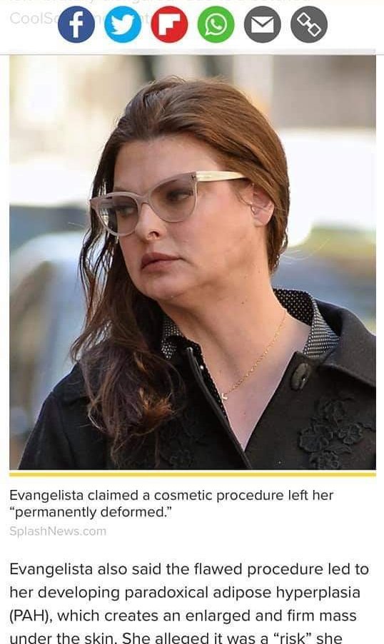 Четох за Еванджелиста, щяла да съди клиниката, която й направила процедурата. Твърди, че не била предупредена за възможните лоши резултати. Мисля си обаче, че вероятно е подписала някакво информирано съгласие. Изглеждала е отлично преди това, за какво въобще се е подлагала на това чудо, пуста суета...