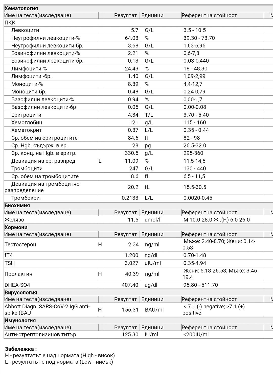 Момичета, не знам какво да правя! Правих си кръвни изследвания поради това че имам силен косопад, вследствие преминат (явно) ковид. Снощи късно ми излезнаха резултатите и съм страшно уплашена и не знам какво да си мисля до понеделник, когато ми е часа при дерматолога за да ги погледне. Знам, че тук всеки е минал през нещо и затова се обръщам към вас. Явно имах 1 полож. тест, снощи направих още 1-той е отрицателен. А ето и резултатите(П. С. нямам окосмяване, нямам мъжки черти, нямам акне, само поддути и чувствителни гърди и  9 дни закъснение)