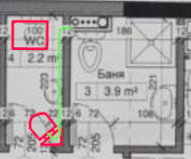 От друга страна не е само до място, но от скицата се вижда къде е канализацията - споделя се обща такава със съседната и ако си преставяте, че ще я преместите в ъгъла до вратата на банята (а самата врата да се отваря навън), то следващия въпрос е как ще прекарате канализационната тръба на 2м?