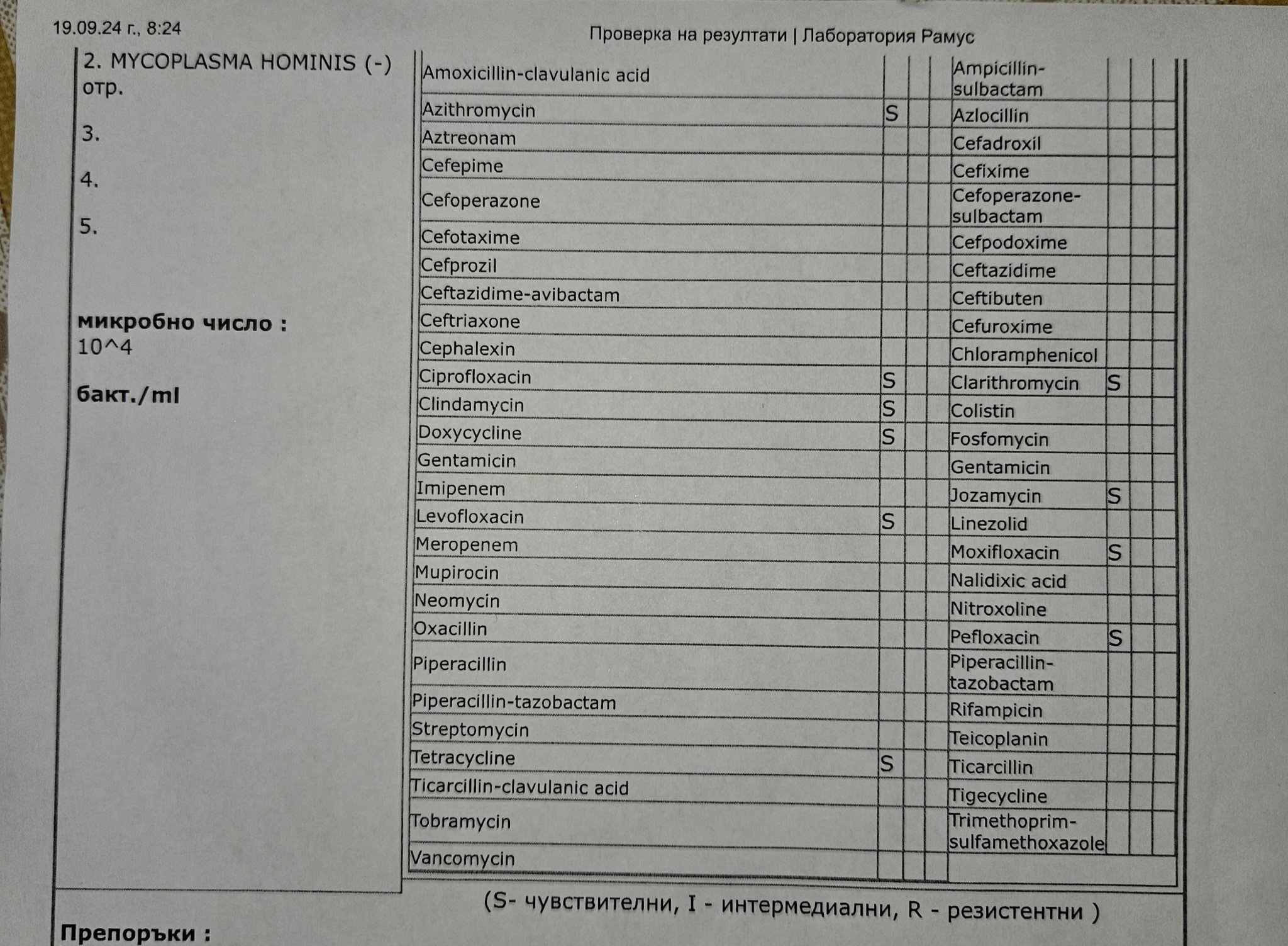 От тази антибиограма може да пиете Азитромицин или Левофлоксацин, но се съмнявам, че ще успеете да си го набавите без лекарско предписание!