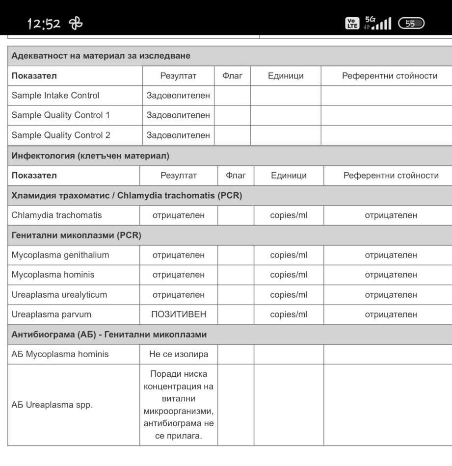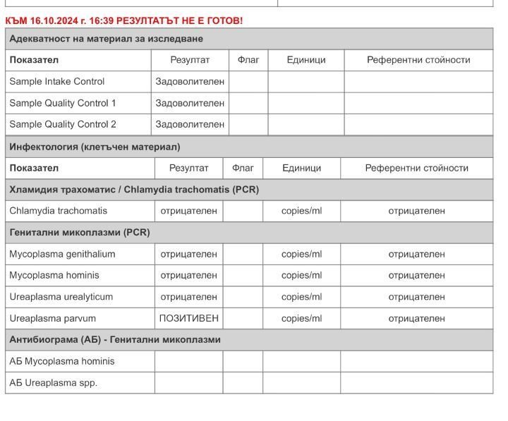 Заради постоянни вагинални инфекции ,които лекувам и пак имам симптоми накрая аз пожелах да си пусна тези изследвания. Да разбирам ,че съм + за Уреаплазма ,но още не е готова антибиограмата ? Лабораторията е Геника Simple Smile