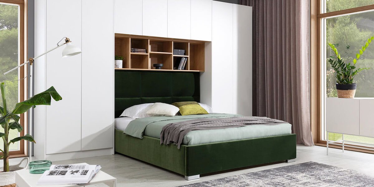 Щом се налага да се позиционира гардероб така около спалнята, и леглото не предполага да е много широко. Обикновено такова решение се прилага при по-малки стаи, когато няма самостоятелно място за гардероб, без да се вреш в него на лягане, ставане и спане.