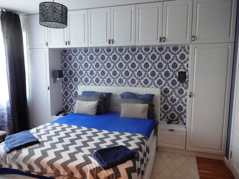 В спалня 12 квадрата, 4х3 м - горните са 30 см дълбочина, страничните - 35 см, ъгловият гардероб е с дълбочина 40 см откъм леглото и 50 см откъм вратата, нощните шкафчета са 40 см дълбоки. Вътре ъгловият гардероб е и с чекмеджета, и с лостове, и с рафтове, шкафовете около леглото са само рафтове.