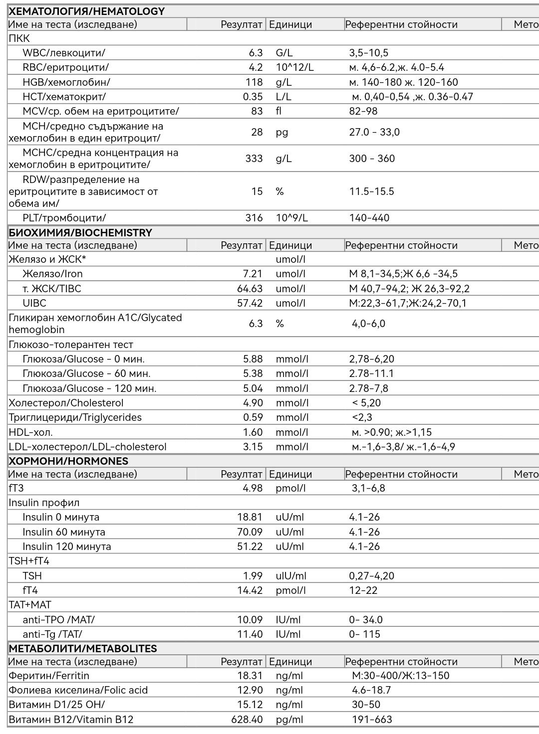 Здравейте. За първи път пиша тук и ще помоля за съвети. Направих си изследванията по-долу. Витамин Д ми е ужасно нисък, а уж приемах около 3-4 месеца спрея на Бетър Ю (3000 UI + К2). Ендокриноложката ми предписа Меглюкон, Вигантол (20 капки на седмица) + едно впръскване на ден от спрея на Бетър Ю, Хром (200 мг) и за хемоглобина и желязото като цяло - ако искам да си взема Билкова кръв. В аптеката не ми дадоха Вигантола без рецепта (докторката явно е забравила да го напише в самата рецепта). Взех си капките на Jamieson, но според мен дозата е доста малка (25 капки по 400 UI). Какво ще ме посъветвате както за вит. Д, така и цялостно спрямо резултатите ми? Simple Smile Да добавя, че от около 4-5 месеца пия вечер магнезий, но докторката ми каза, че е хубаво да правя почивки от него. Това за първи път го чувам. Та трябва ли да почивам от магнезия? Simple Smile
