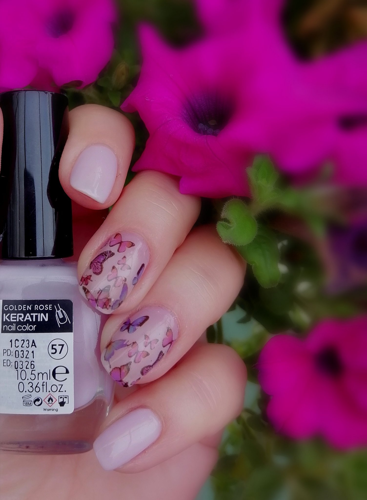 Разкошен млечно люляков цвят със стъклен блясък, който снощи по здрач не можах да уловя. Консистенцията е "млечна" с "балеринска" прозрачност и ефирност, трябват три слоя за плътност, но и на два слоя е много нежен.