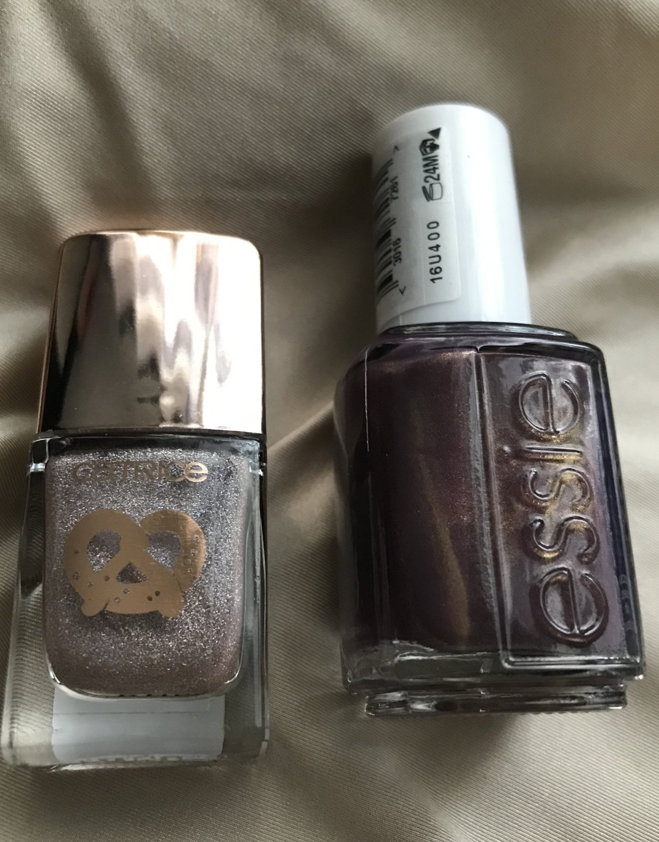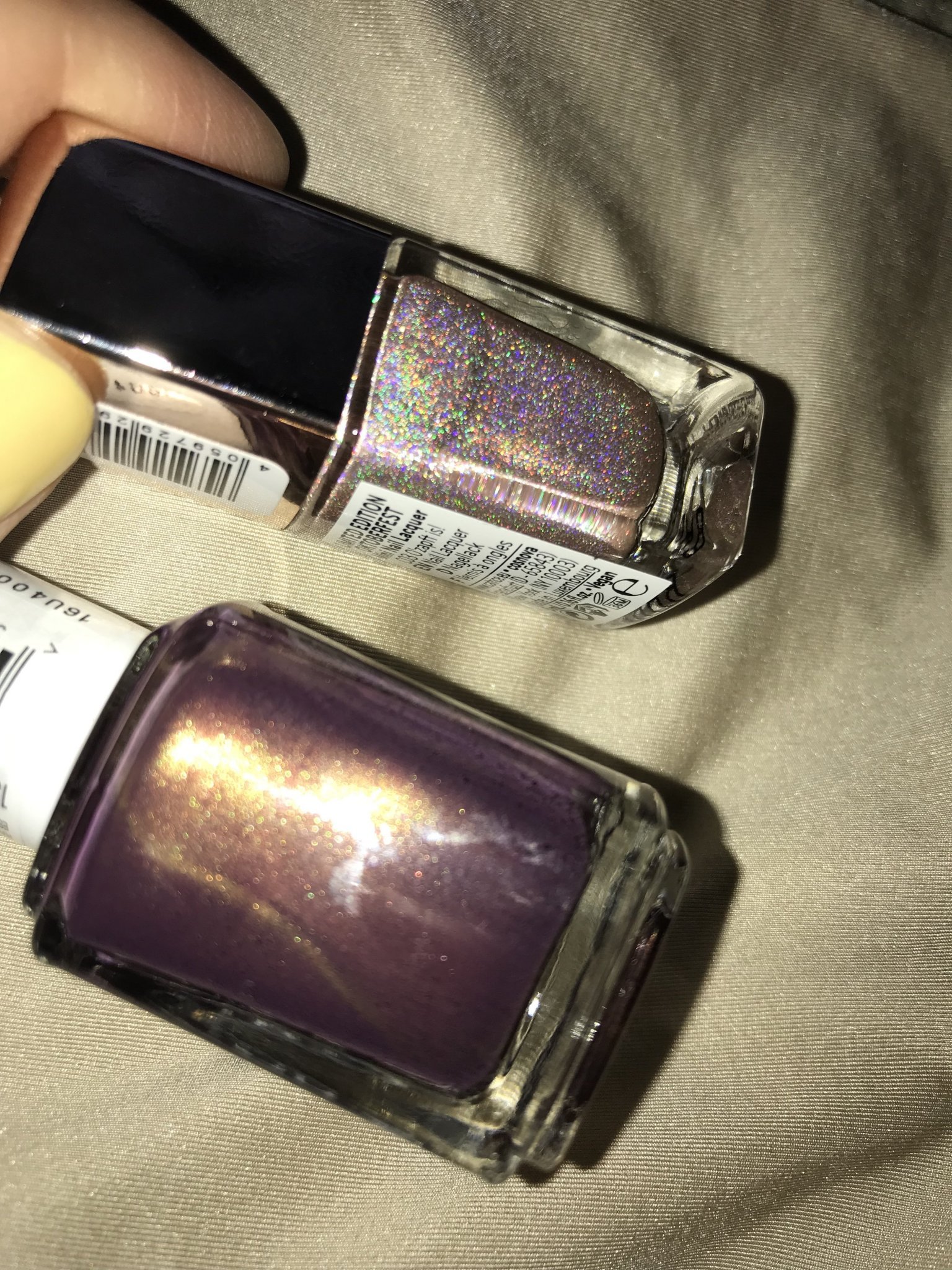 Essie Star Struck a Cord от есенната колекция - тъмен патладжан със силен златист шимър, за съжаление пак има разлика в цвета между US и EU версията и нашият е по-кафяв, а американския по-пурпурен; и мини холо Катрис от Октоберфест колекцията номер 03.