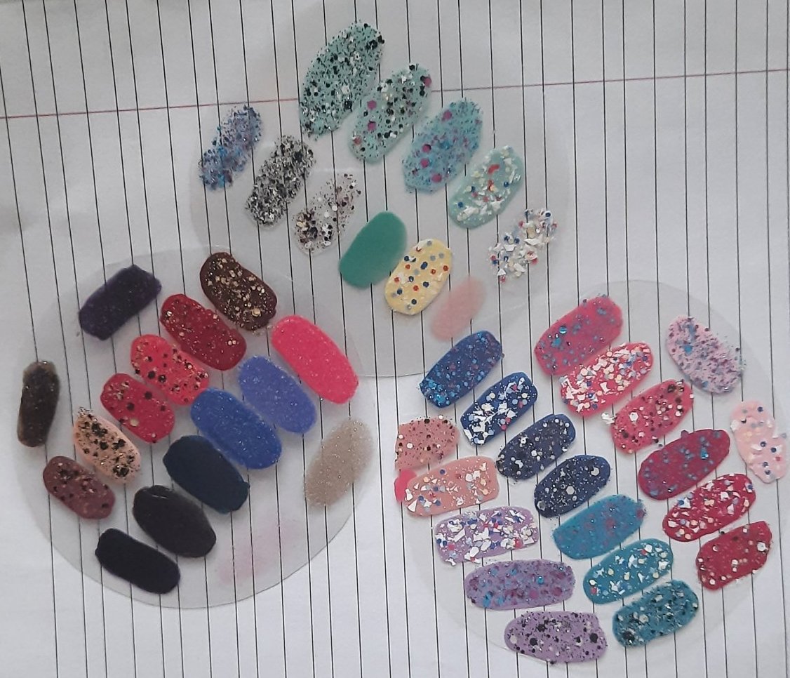 Ето малко шаренийки от мен...от времената когато тъкмо откривах лаковете на Бел и Флормар Фул калър серията 😃 Вижте как прилежно съм изрязвала капачки от кисело мляко! 🤣 Има го някъде и брокатът който показа Арабеск. На различни нюанси синьо, сиво и червено, на розово и лилаво, на бяло, черно, бежово и синьо, дори на жълто или прасковено го виждам добре. 🙂 Принципно избягвам нанасянето на подобни лакове на всички пръсти и заради "забавното" сваляне после. Като акцент (по моите виждания) не е кичозен...