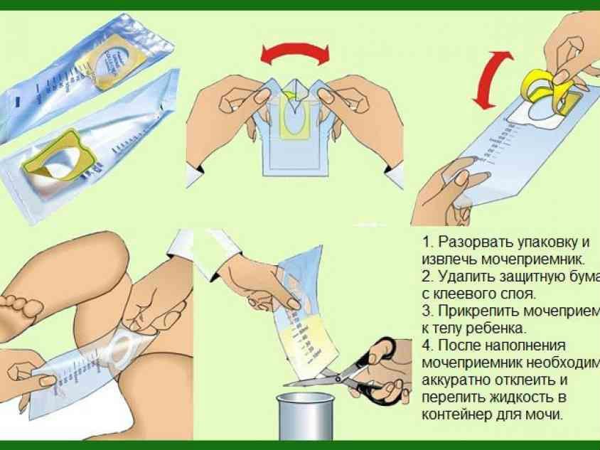 С колектор за момиче или момче, от аптеката, след измиване и подслушване се залепя и събира урина, пренасяш в контейнерче, от аптеката отново.