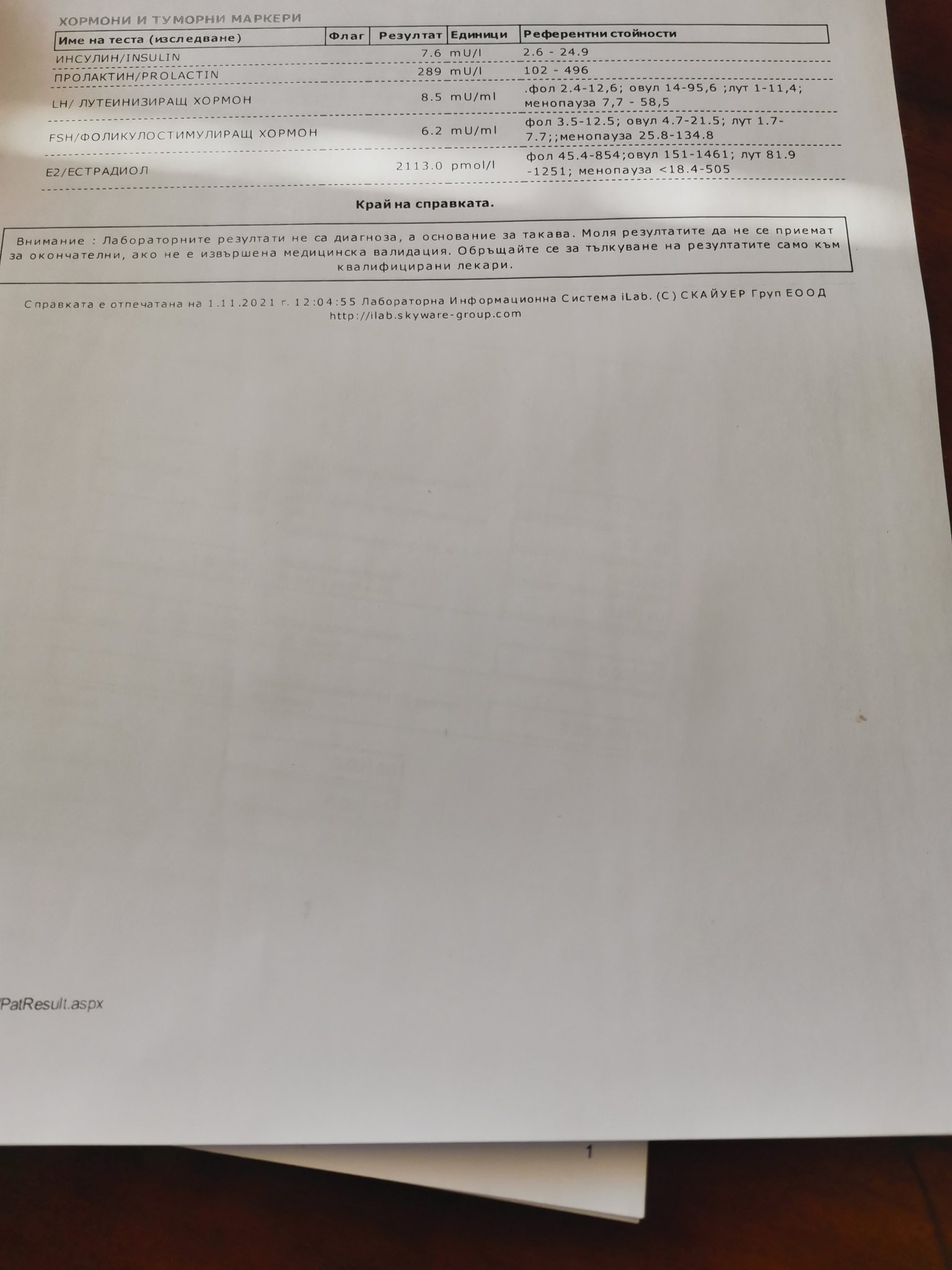 Добър ден. Това са моите резултати на хормоните на пети ден от цикъла. Пускани са поради нередовен цикъл и една загуба в 9г.с. Имам две нормални бременности и една загуба в 9г.с. Също така се борим за още едно дете, ако стане предвид възраста ми-39г. На 11.11 съм на гинеколог, а на 13.11 на ендокринолог. Може ли някой с коментар, че аз нищо не разбирам?