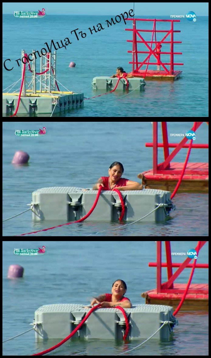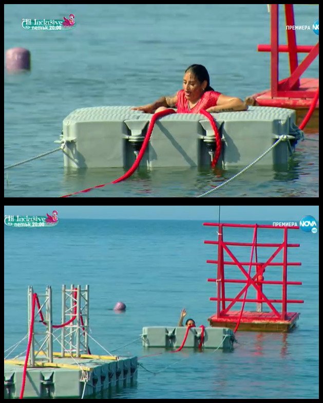 И изобщо оправданието й за водата издиша - тя нямаше проблем с водата, просто не можеше да си вдигне дупето. На понтона трудно се качи, по-скоро се издърпа на въжето, на другите Стоян я преведе - не е честно. Трябваше да я оставят докато го мине. Или директно да слагат сериозни наказателни минути.