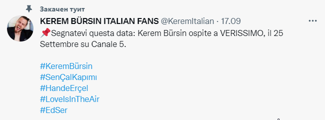 Продължава промотирането на Керем Бюрсин за участието му във Верисимо, тази събота. Този път рекламирането идва от италианския Фен-клуб на Керем.