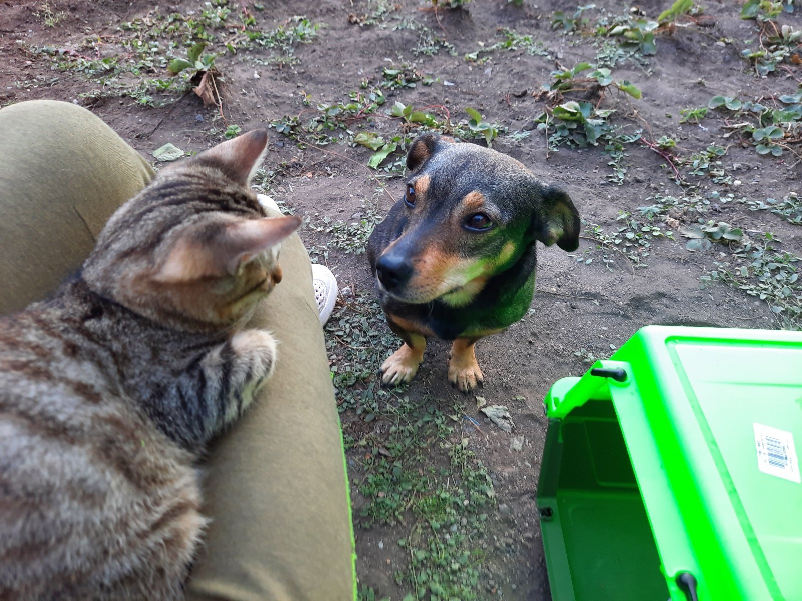 Тя го дебне и му хъска. Понякога отива и го перва с лапа. Понякога само го гледа. Това е нейната къща и трябва да го изгони.