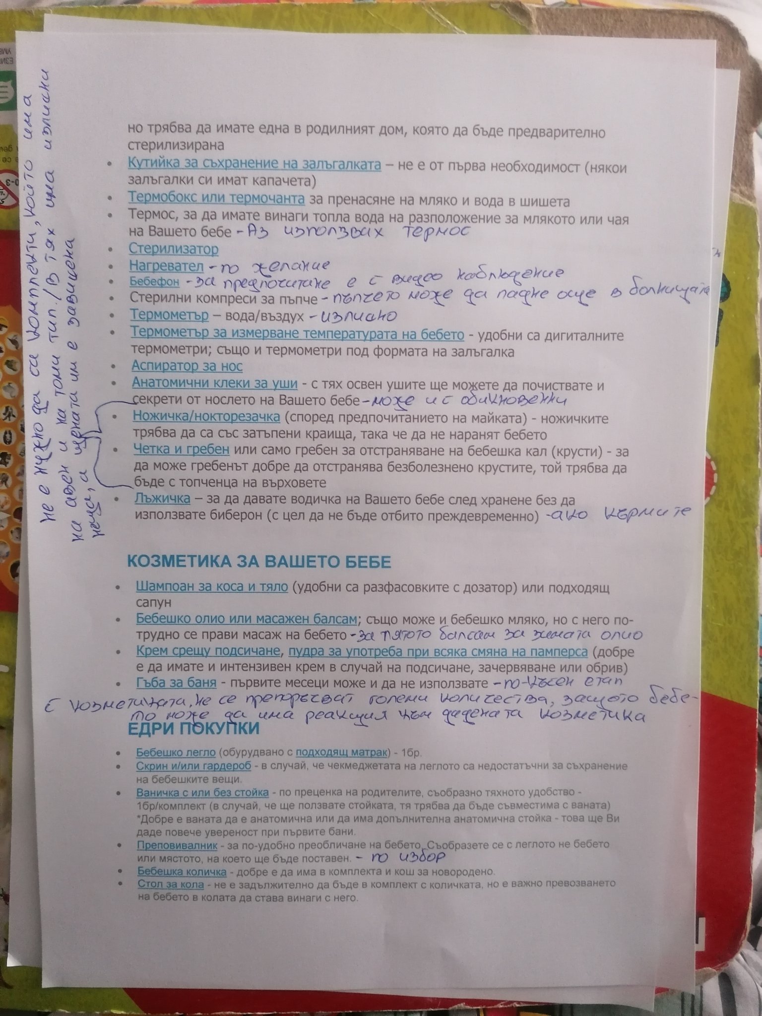 - Биберони - не се презапасявайте, аз имах всякакви, но синът ми отказа да ползва биберон още от начало ги плюеше и така и не е ползвал. Вземете 1-2 за проба