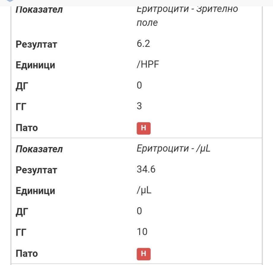 Пуснах и дизморфни еритроцити в Александровска, излиза резултат 9%, при горна граница 20%. Доколкото успях да разбера, този показател се отнася за проблеми с бъбреците, та явно кървенето не е от тях (камъни, песъчинки). Прочетох, че има още един вид еуморфни еритроцити май беше, обаче това не съм го пускала.