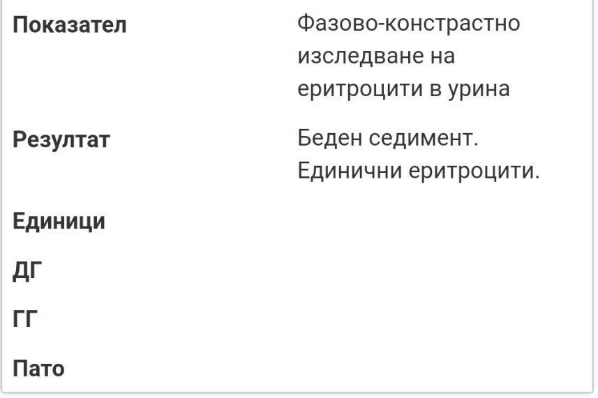 Изследването, което назначи доц.Петкова също изглежда да е наред. Или урината вече не е била годна. Утре мисля да повторя изследването, но с урина, дадена на място. А ако е била годна и резултатът е коректен, то не знам как се тълкува на фона на еритроцитите.
