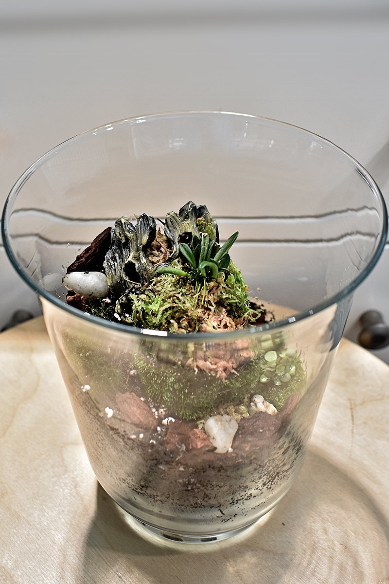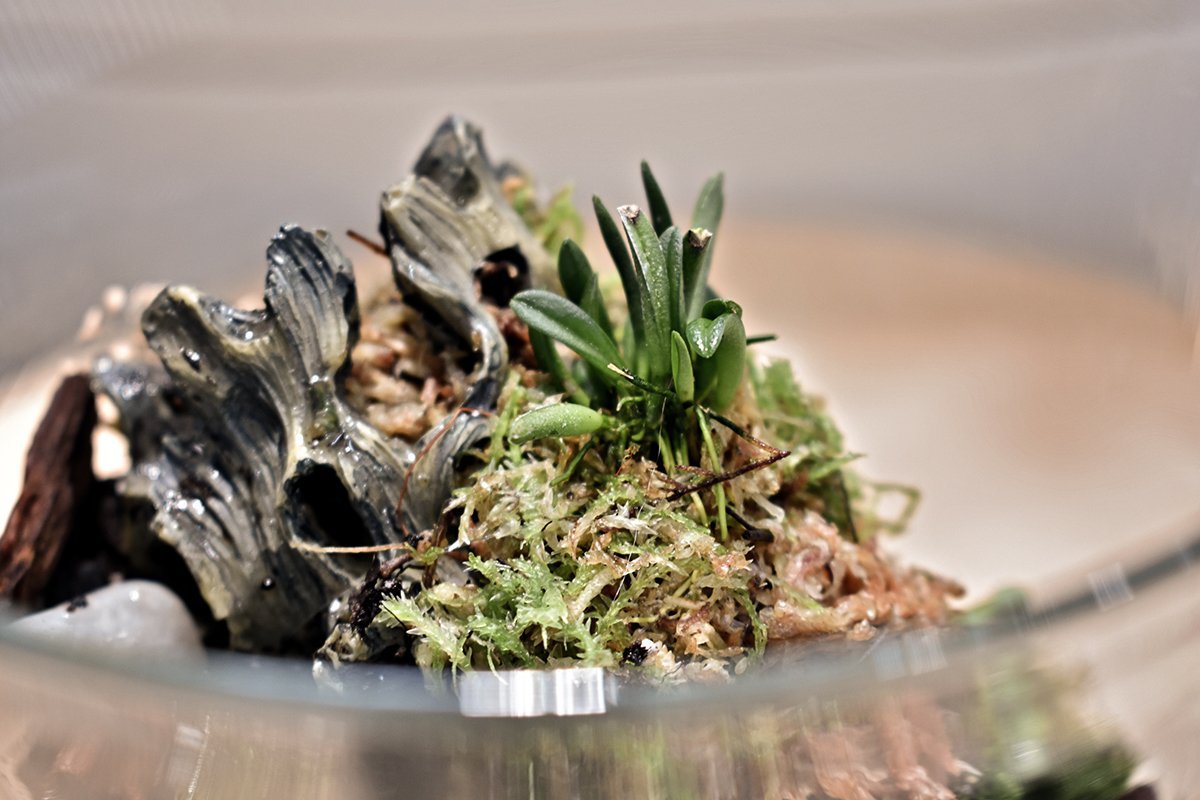 Терариумът за орхидеи е затворена среда, обикновено сферична или куполообразна, която създава микроклимат за растенията. За да го поддържате, използвайте сфагнум и керамзит като субстрат. Поддържайте лека влажност на сфагнума чрез редовно поливане или пръскане или чрез добавяне на малко вода в дъното на терариума, позволявайки на сфагнума да абсорбира влагата. Контролирайте температурата, като избягвате прекомерна топлина.