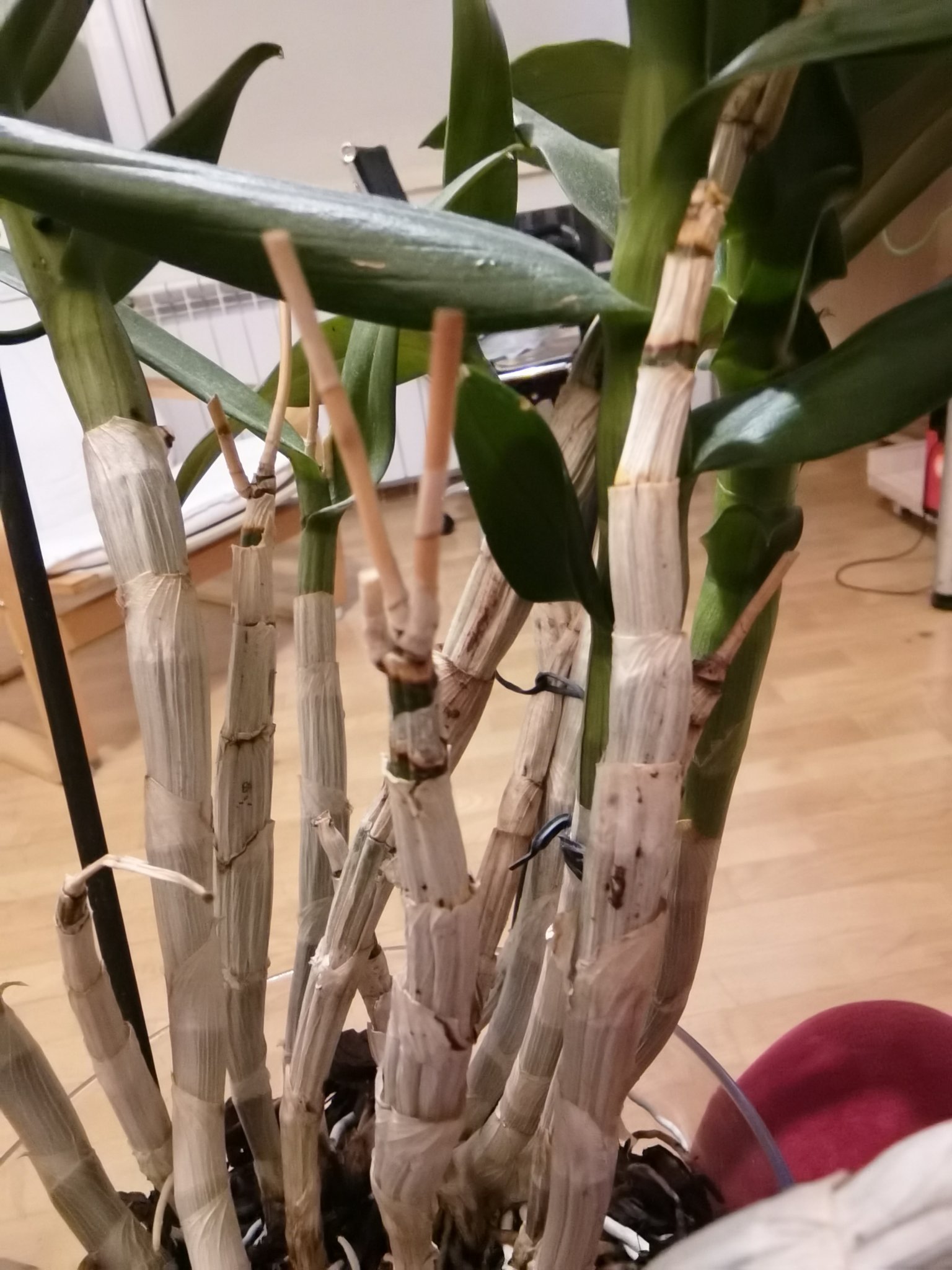 Горното не е цветонос, защото на това стъбло вече е имало 2 цветоноса ( двата v образни остатъка на върха са от цветоноси). При дендробиум фалаенопсис цветоносите излизат от върха на стръка след порастването на последното листо. И повече от 2 цветоноса на стрък не излизат. Цветонос излиза от нов стрък, не от стар.