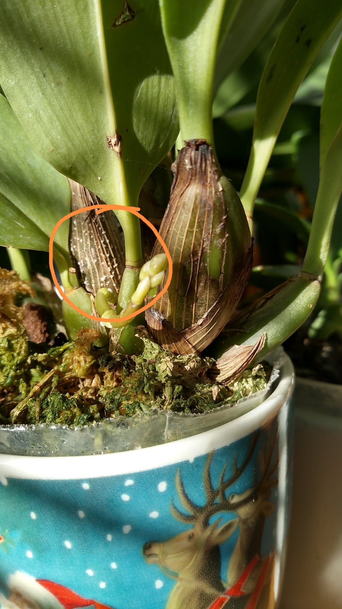 Като пристигна орхидеята пролетта я третирах с Топсин, Моспилан и Валмек преди да я позиционирам сред останалите. За цяло лято направи 3 нови булби, а сега изкарва още 2.