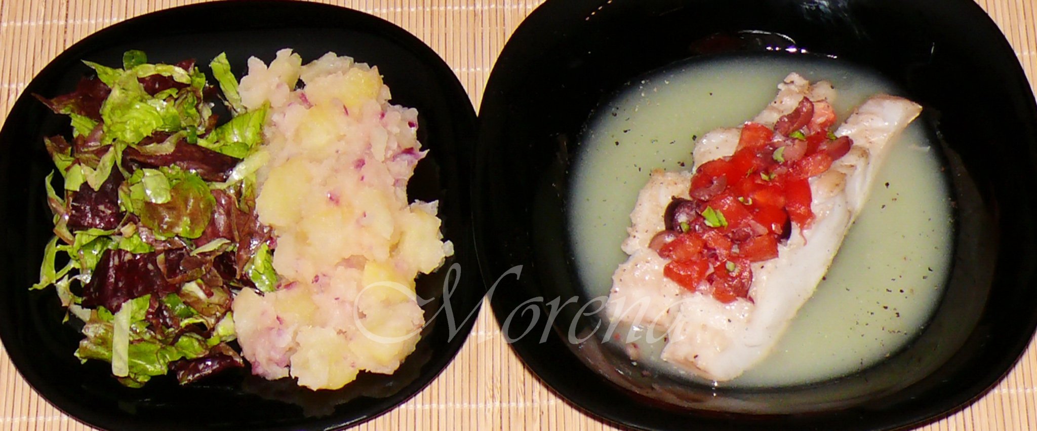 И снощната вечеря Треска на тиган с картофен сос и доматена салца с маслини и червен лук;  карофена и зелена салти