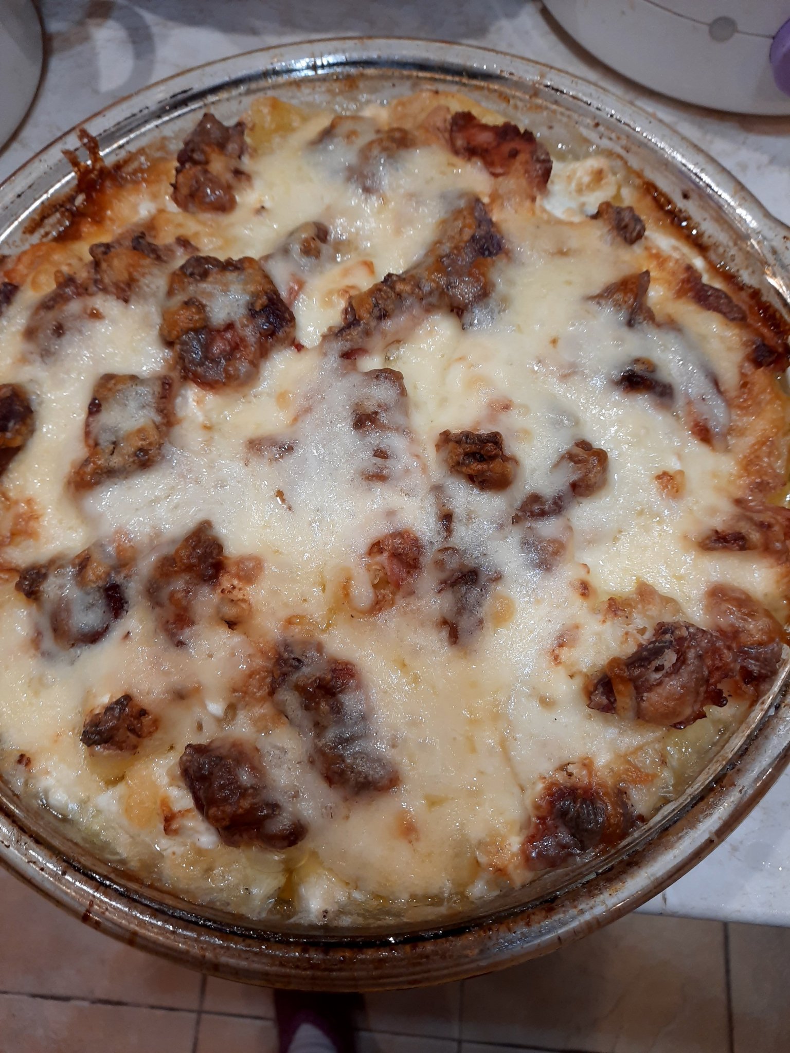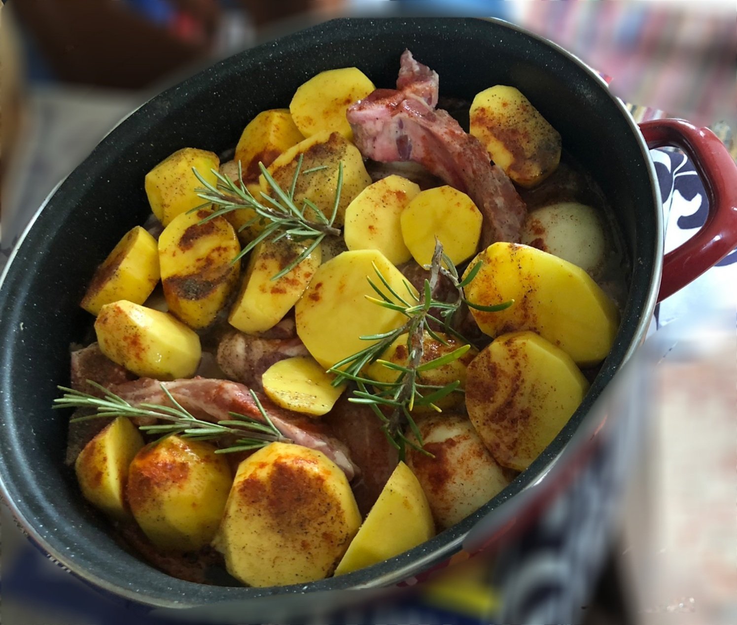 Когато зеленчуците омекнат, наливам хубаво бяло вино и оставям да се поизпари алкохолът. Посолявам, слагам малко червен пипер и изсипвам предварително настърганите домати или от консерва ако нямам пресни. Прибавям подправките - дафинов лист, черен пипер на зърна, може малко лют пипер ако обичате, чубрица, мащерка и щипка захар за балансиране на киселината от доматите. Намялям огъня и оставям да се готви под капак, като разбърквам периодично. Ястието трябва да остане с малко сос, да не е чорбаливо. Аз обикновено не сгъстявам с нишесте или брашно, защото няма нужда, но ако сосът е много рядък е хубаво да се посгъсти. И...това е