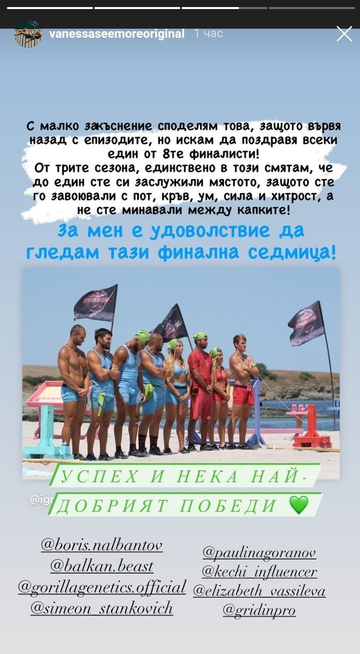 Просто Симеон се вписа лошо там, развали отбора с простотията си. Много лицемерен и простоват , а не се усеща и става смешен. Същото направи Мани с другите, цял сезон я влачиха, губеха битки заради нея, накрая тези дето изнесоха тежестта отпаднаха. Симеон трябваше директно да си ходи след загубата с Марти. Бил направил услуга на Елизабет да спечелела пари, ама иначе той искал да ходи, ама нямало как да се разкрие, е направо...ме срази. Но тази вечер след сабите на Андрей направо ...толкова ми харесваше изражението му , че... Трябваше той да е номиниран, хем да тръпне в очакване, хем пак да е на битка. Страцимир е силен участник, но Симеон ...може би ще има повече шанс срещу Страцимир. Не знам защо Поли не я номинираха, може би от неудобство или ... Не знам на Елизабет кой би могъл да е по-лесен.