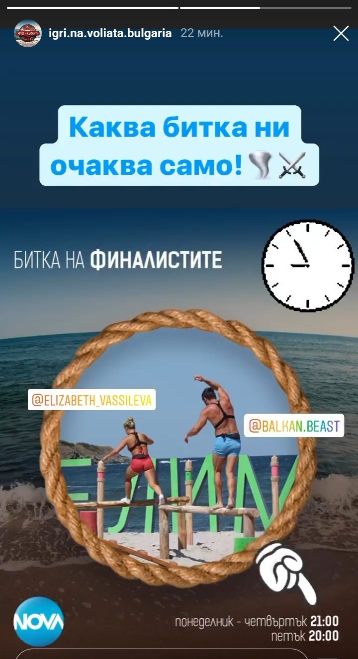 Аз заспах и не изгледах битката(( Разбирам, че Елизабет е паднала. Някъде в началото го хванах, това беше подобна на битката Паулина-Мартин. Всъщност за мен Паулина я бутаха, защото на тази битка си беше чиста подигравка с Марто. Симеон пък го направиха редови участник, а трябваше да си отиде, чак при сливането отшелника да беше се върнал, както Елизабет примерно, но..по тази логика и Марто трябваше да го причислят към някое племе. Така и нямаха правила , състезание не се прави така, то си е нещо друго.