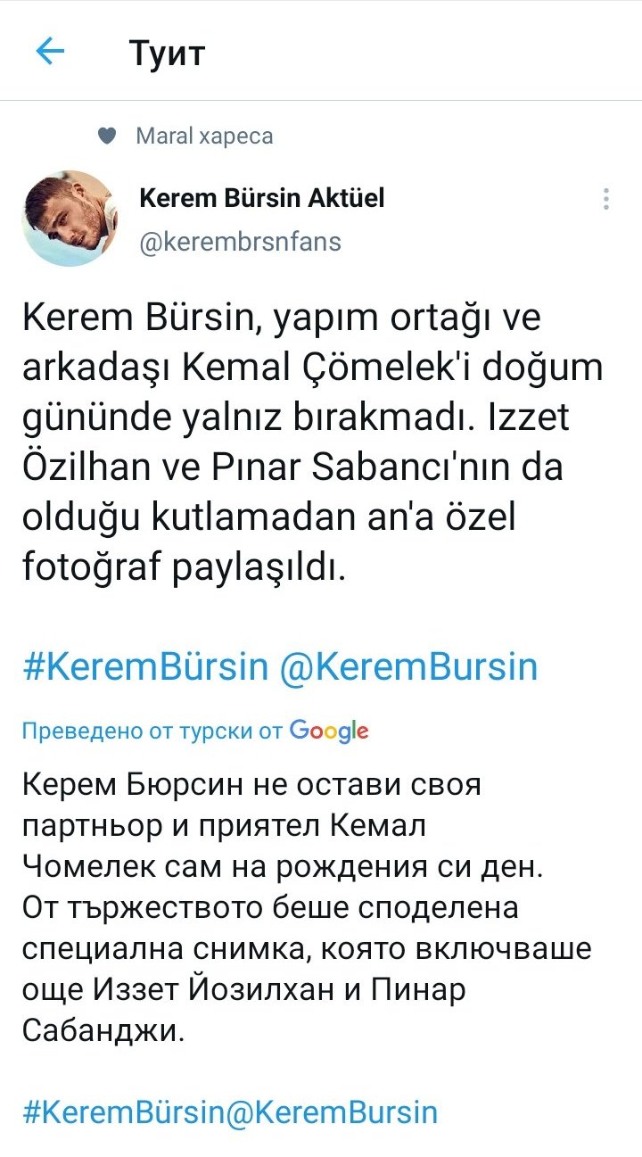 Позамислих се и аз за това. На мен също не ми е окей, да ми изкачат в страницата на сериала други проекти, които не ме вълнуват. Продуценти на рекламираният сериал не са дори MF Yapim и явно Фокс управлява профилът. Ханде и Керем не следват Фокс и не са го следвали изобщо. Ханде не следва страницата на Aşk Laftan Anlamaz и съм склонна да не задълбавам. Все пак мисля, че има голям сантимент към сериала и нещо я е провокирало да го отследва.