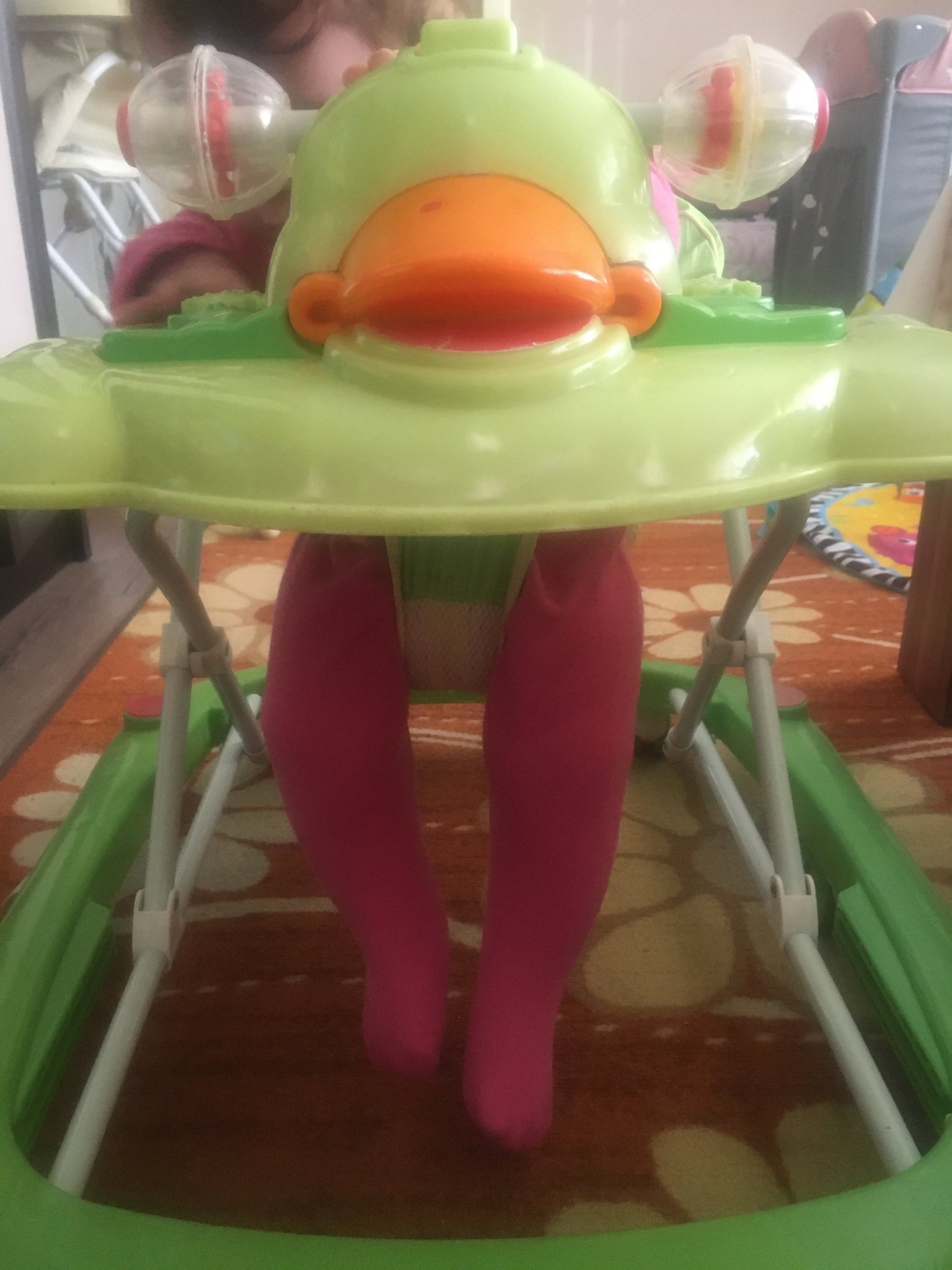 От долу под таблата се регулира на най-малко 3 степени. Нашата я слагаме от 5ти месец, но незнаеше как се ходи напред, само назад бръмчеше 😅.. От седмица се усети, че може и напред, и даже потичква😅 само килима и е труден за изкачване, но ще го махнем, че се ядосва 😅😅
