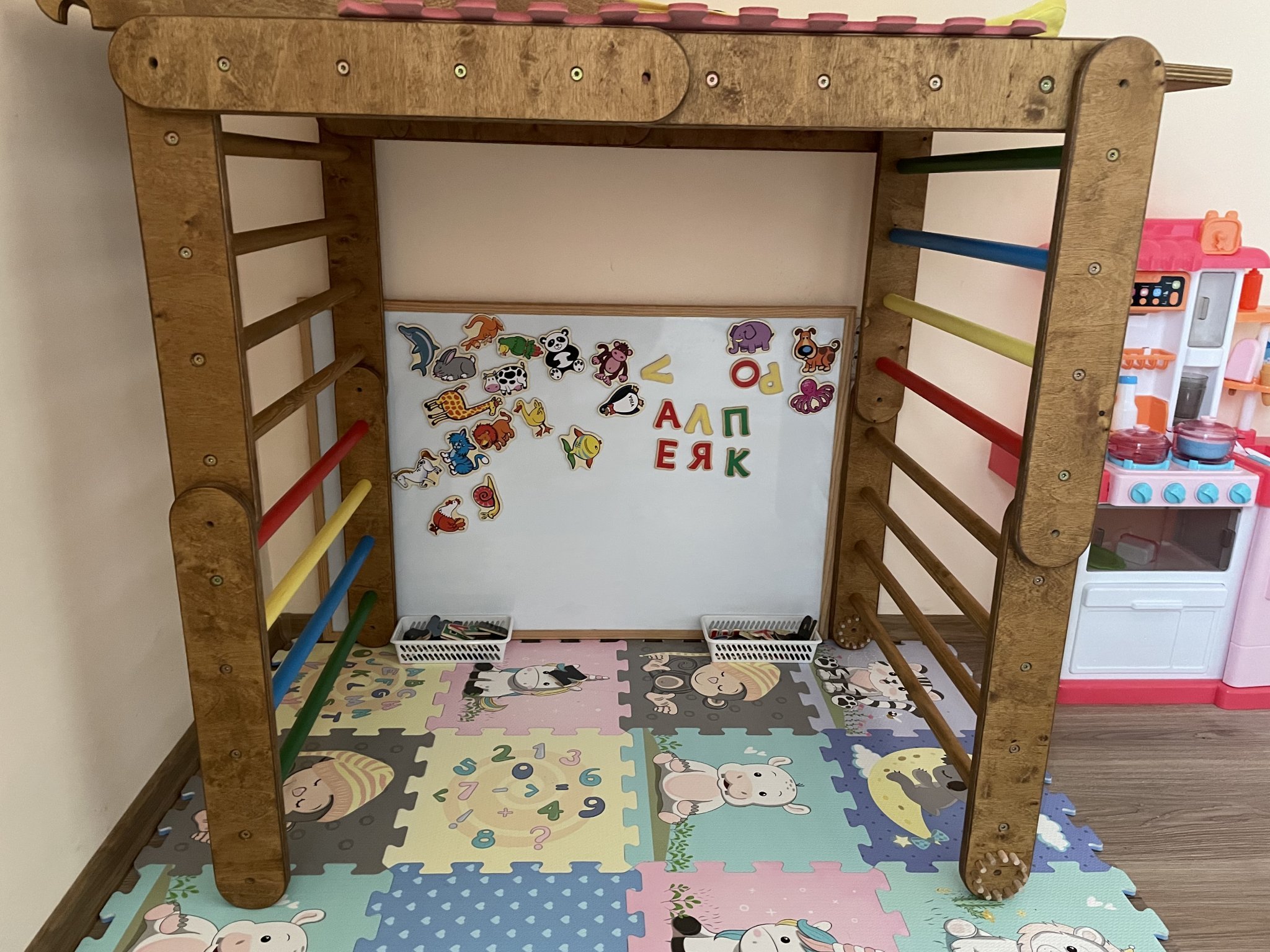 Яна, дъската ни е мн голяма и съм я купувала преди време от офис уан, затиснали сме я с пиклера до стената и тя се вре вътре в “нейната къща” и там играе. На скоро купувах от емаг за приятелка дъска куфарче с части на животни, които са като пъзел, но за по-голямо детенце. Още сме в процес на обзавеждане на детската стая , но скоро ще закача дъската за стената и съм и подготвила едни панерчета, за да сортираме букви, животни и плодове