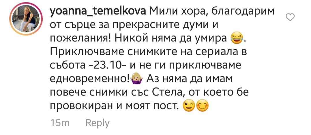 Мненията за актьорската игра на Искра Донова и Стойо Мирков в сериала са смесени. Някои хора ги смятат за талантливи актьори, докато други ги критикуват. Въпреки това, като цяло форумът изразява разбирането, че актьорите не трябва да се бъркат с техните герои, като се отбелязва, че те са актьори и не трябва да бъдат мразени заради ролята, която играят.