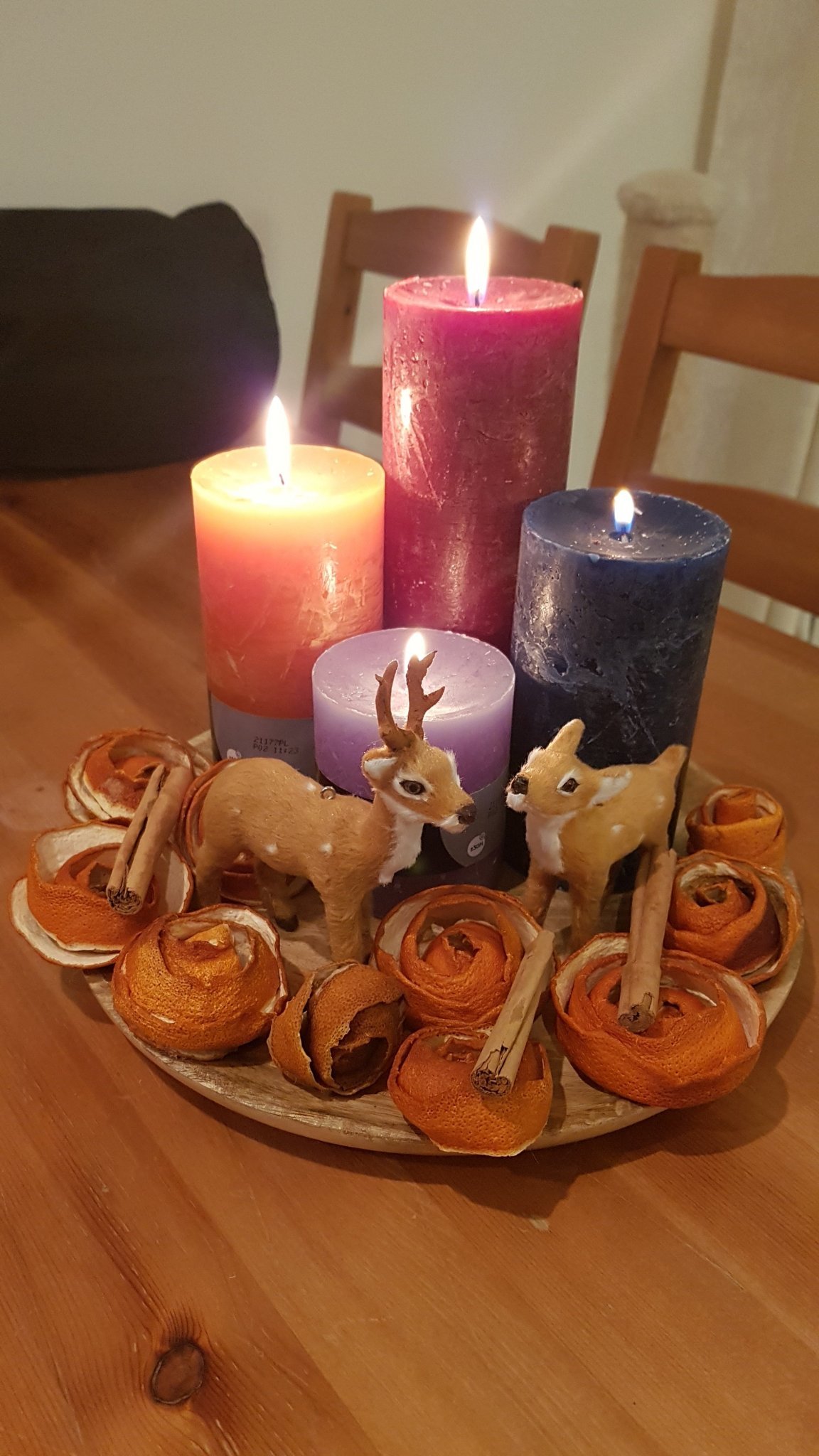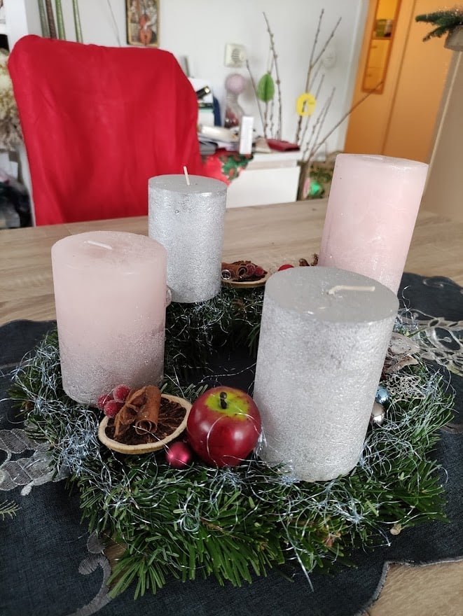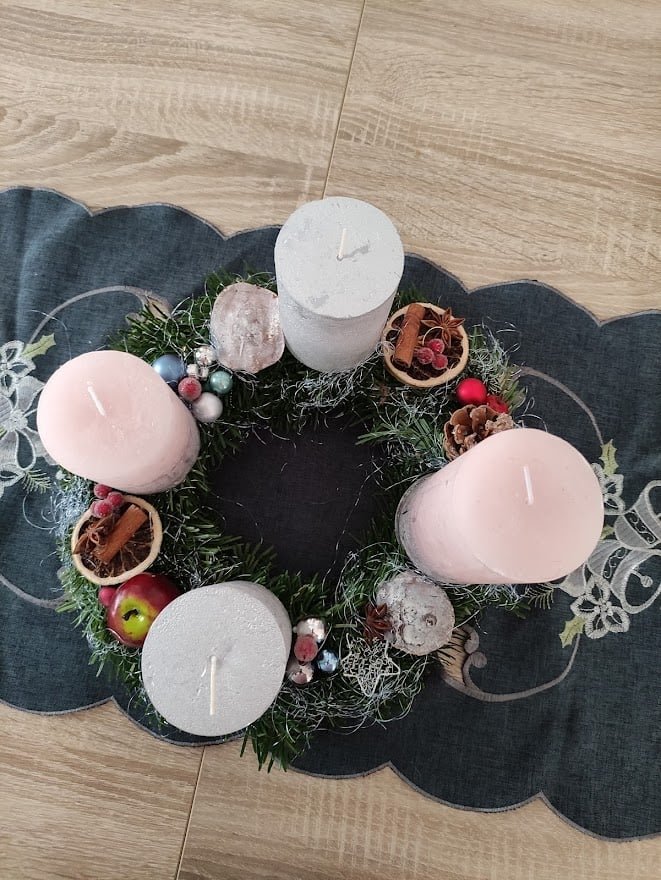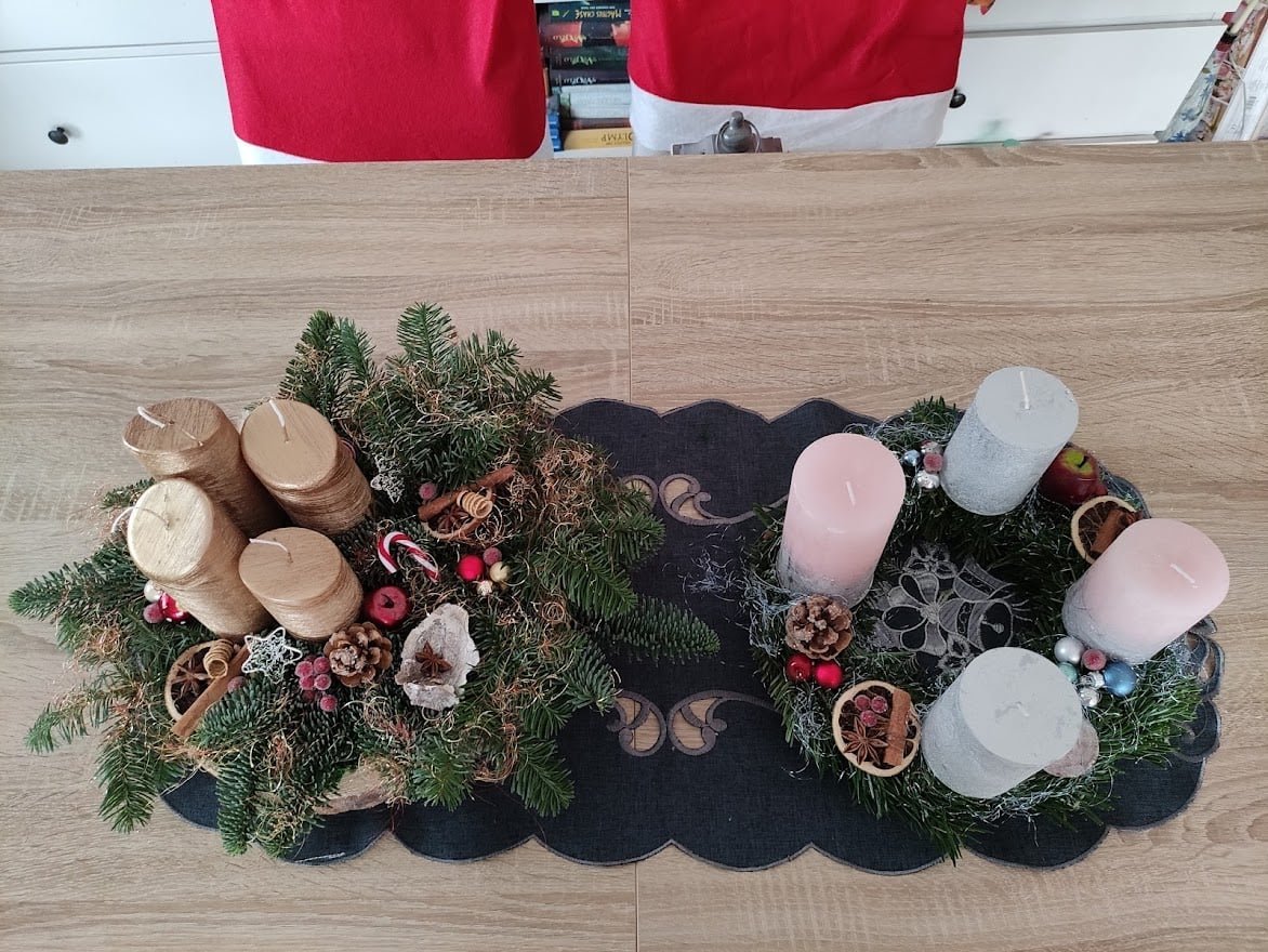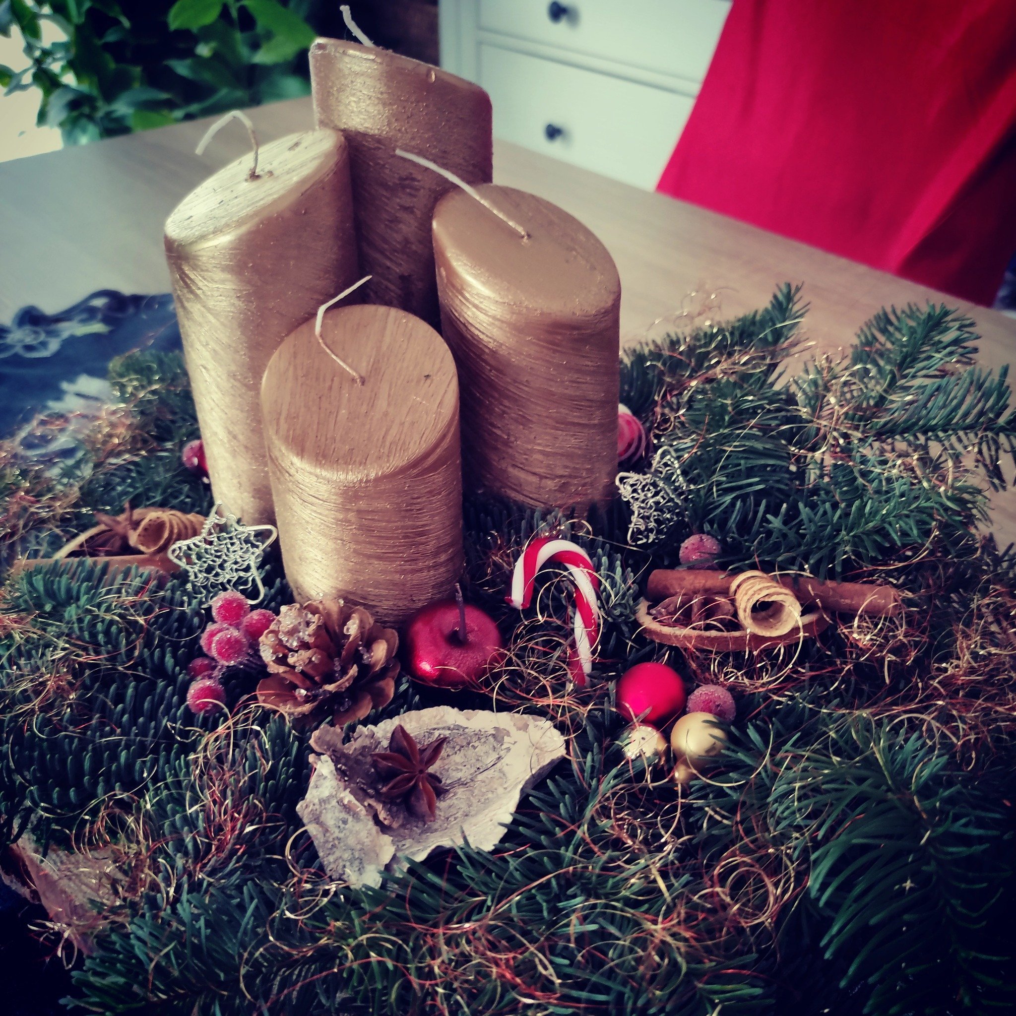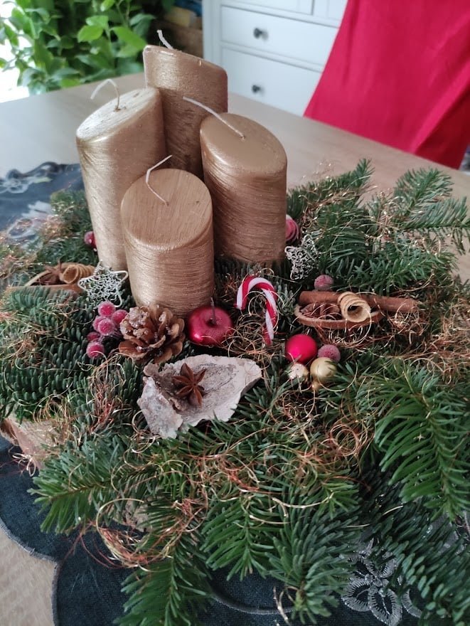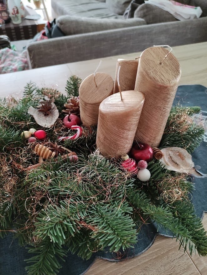 Започвам и аз лека-полека да украсявм, защото имаме много декорация и отнема доста време. В началото слагам само разни Коледни елементи из къщата, после лампички, а елхата украсяваме винаги на 6-ти. На 1-ви отиваме с комшийката в един градински център нa уъркшоп за Коледни венци, за да отбележим началото на адвента.
