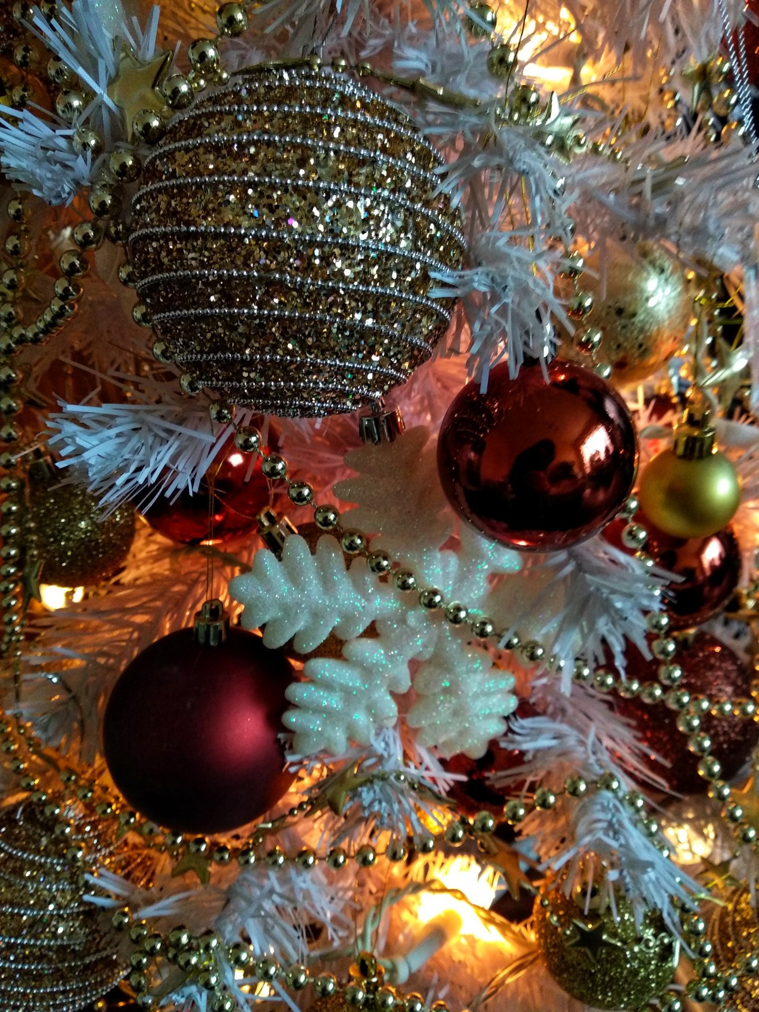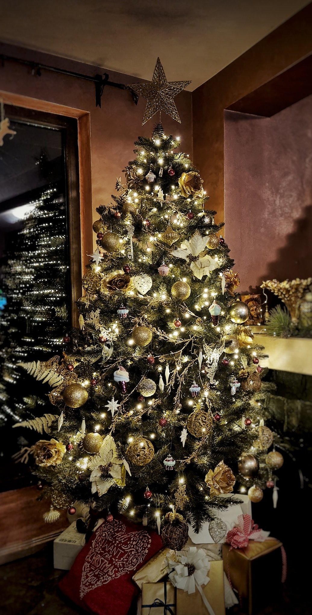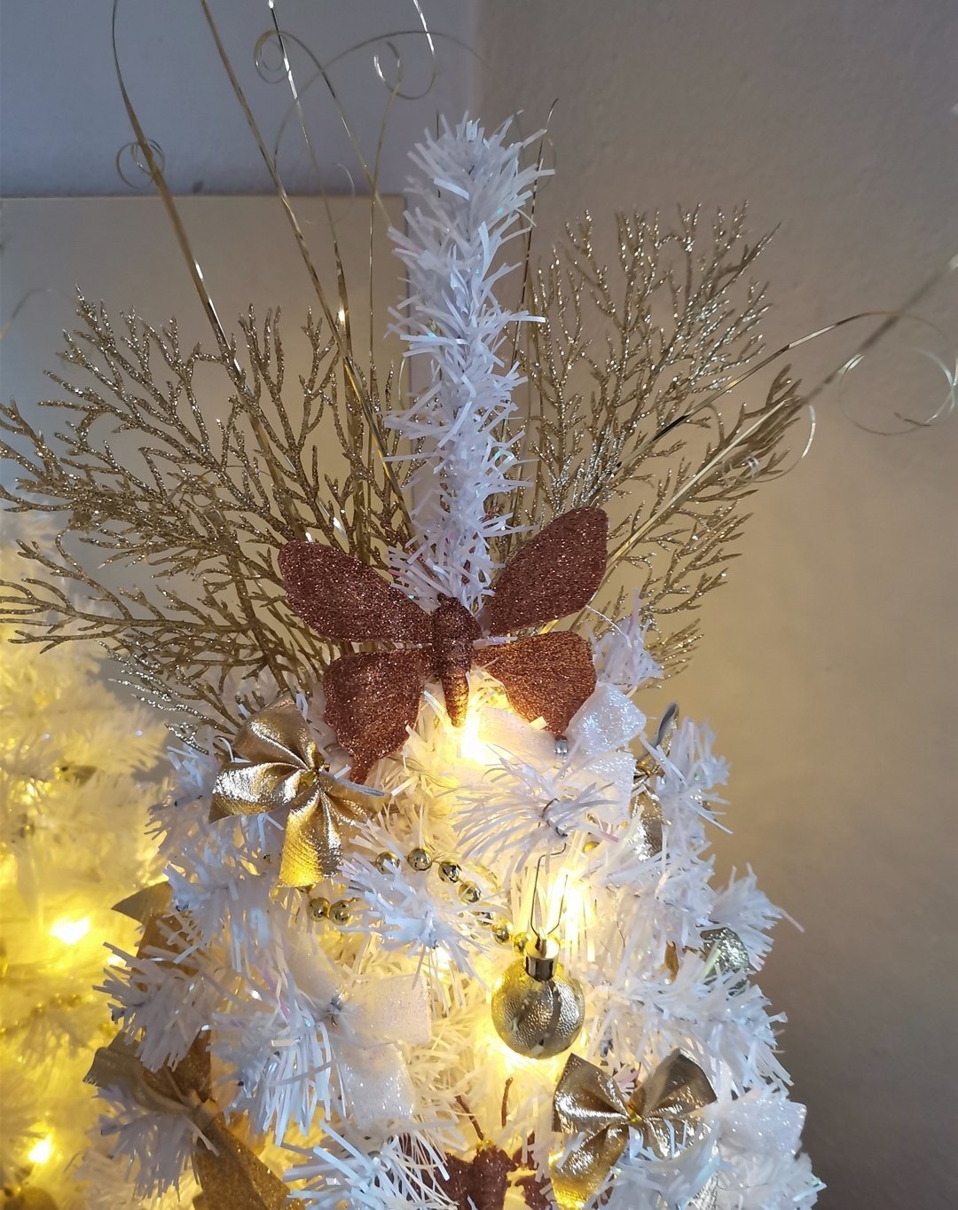 Почнах малката елха вчера, но сложих лампите и се оказа, че нямам достатъчно златисти топки и панделки. Та я зарязах неукрасена.