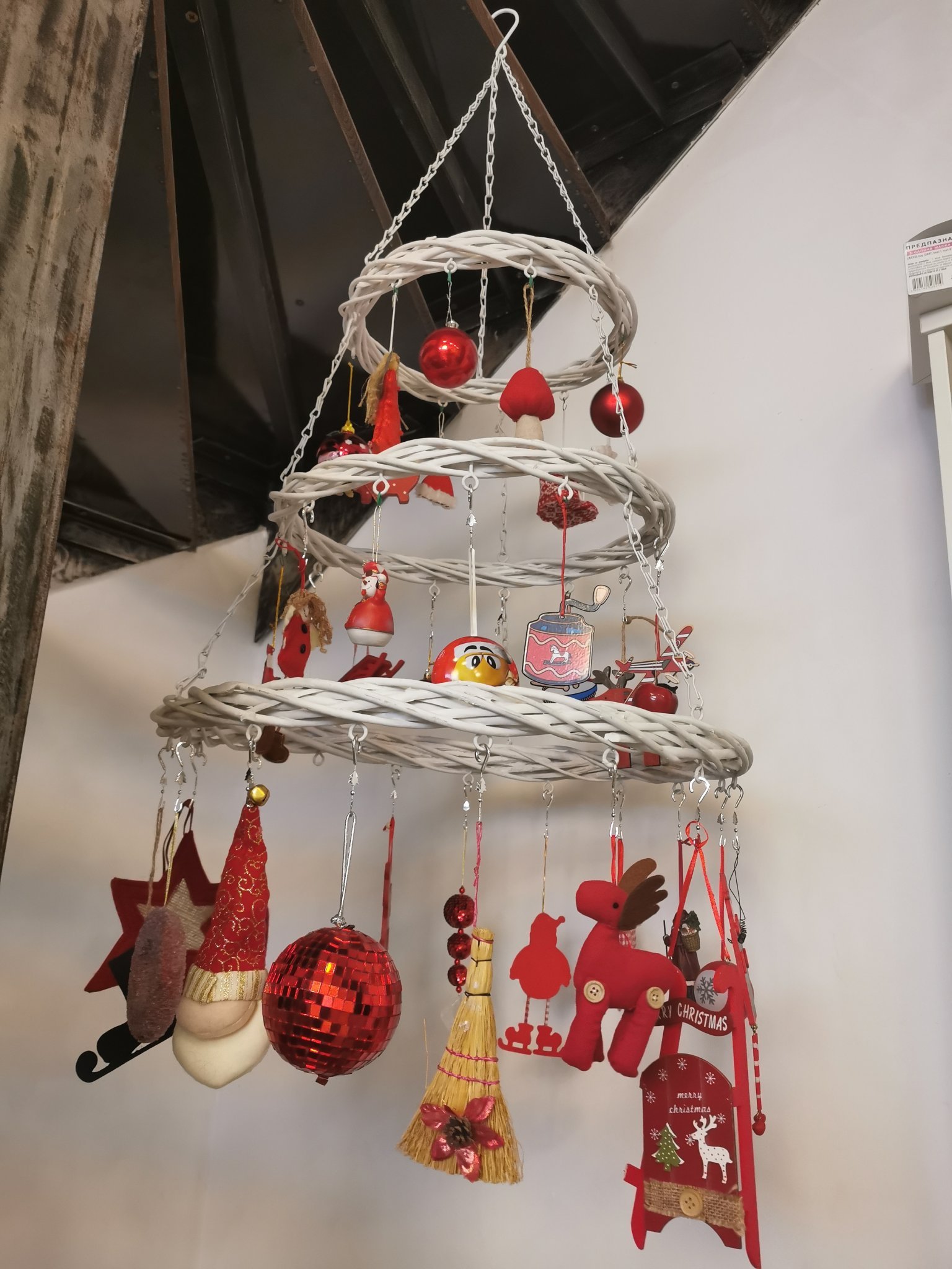 Вкъщи имам 4 елхи, защото са в различен стил и са в различни стаи да не се "бият". След палетената ви показвам "висящата".Под стълбата е нейното място. Обичам светлите и неутрални цветове за Коледа, но за тази елха извадих червените играчки, дълго стояли в кашоните.... Simple Smile