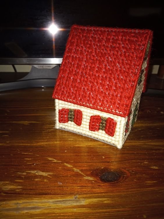 Това е бродирано върху пластмасова канава и подходяща прежда, средно дебела или тънка на два ката. Иглата е губерка за зашиване на плетиво. ето това го правих но с други цветове.