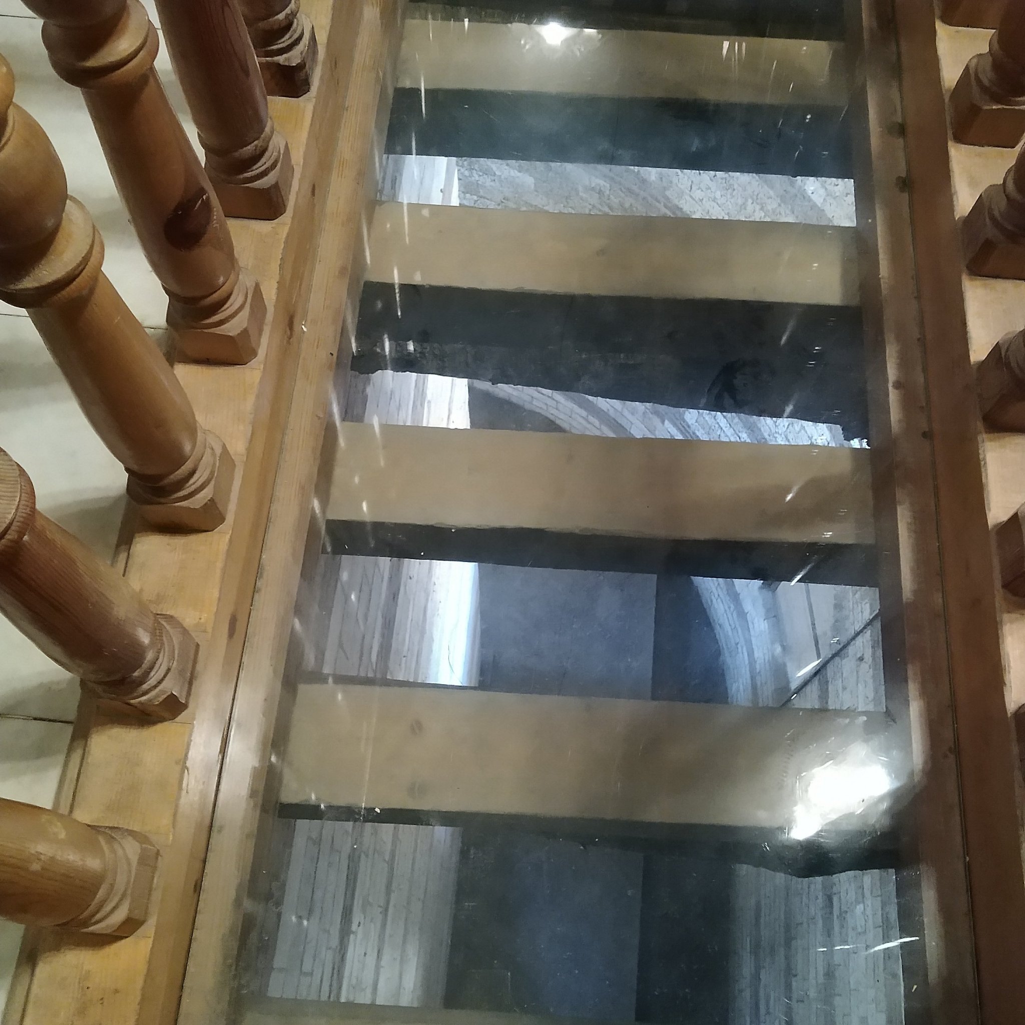 През стъкла на пода се вижда как висящата църква е стъпила на вавилонската кула и "виси" във въздуха