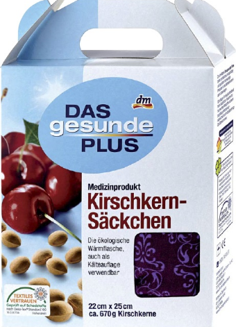 "В асортимента на dm България може да намерите възглавничка с черешови костилки от dm марката Das gesunde Plus, с размери 22 см на 25 см. Затоплена тя е подходяща за затопляне на изстинали части на тялото, схващания на врата, болки в раменете, хронични ревматични оплаквания, болки в мускулите и схващания. А изстудена може да се ползва при главоболие или мигрена, контузии, разтежения или навяхвания, ставни възпаления или схващания, напрежение в кръстни връзки."