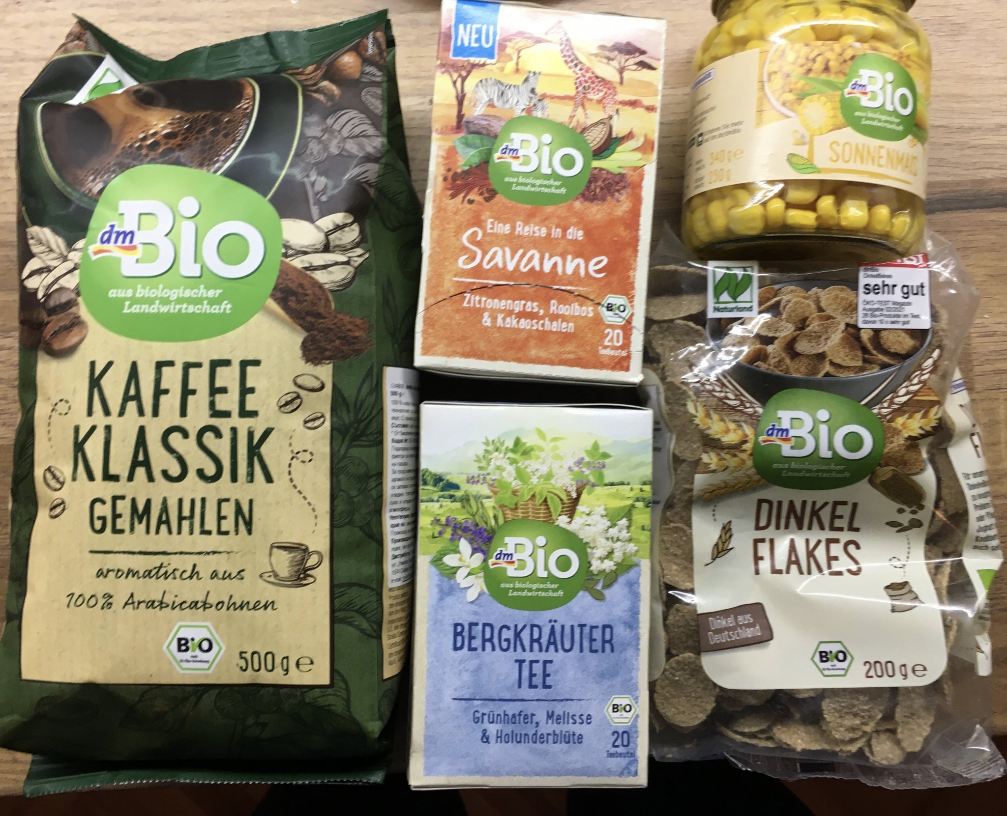 Пуснали са нов чай с ройбос, какао и лимонова трева - в кафявата кутия, ще го изпробвам. Другият чай е с планински билки. Любимото кафе и царевицата без захар (голяма трудност е да се намери такава). И последно корнфлейкс от спелта.