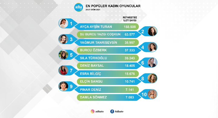 Красивата актриса също получава много успешни резултати в публикациите си в социалните мрежи. Айча Айшин Туран, която пое главната роля в сериала на Ада Масали с Алп Навруз, явно надмина всичките си съперници миналия месец. Актрисата, която сподели 1 милион 800 хиляди съобщения за период от 1 месец, стана най-обсъжданата жена.