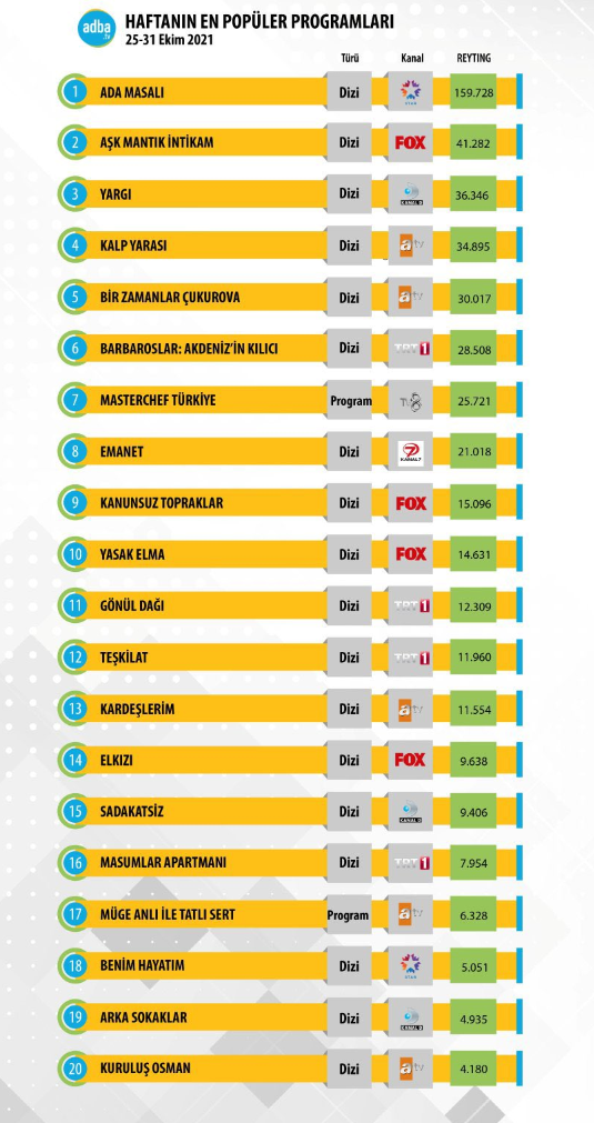 Друг романтичен комедиен сериал Aşk Mantık İntikam зае второто място в класацията на Adba TV. Сериалът, в който Бурджу Йозберк и Илхан Шен изиграха главни роли, стартира през лятото точно като „Островната приказка“ и се премести в новия сезон. Love Logic Revenge се среща с публиката по Fox TV.