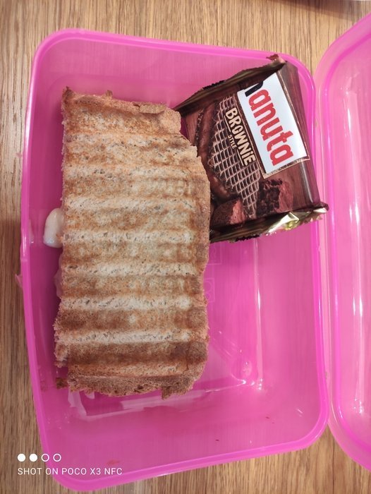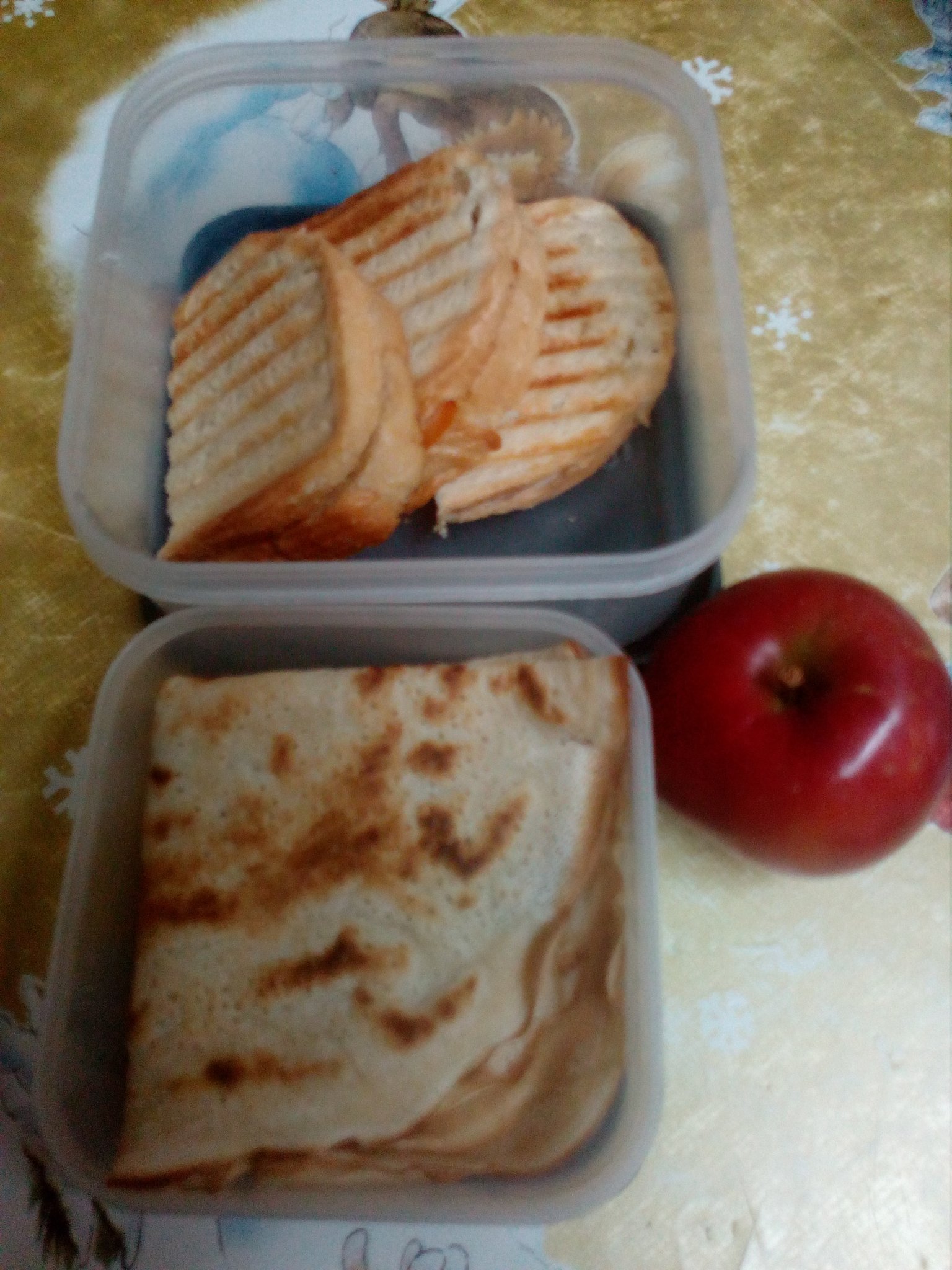 Сандвич с крема сирене , шунка и кашкавал, салата, круша, киви, шоколадче, мъфинче и ябълка за всеки случай. Храната на обяд не я харесва много, ако хапне едното пак добре и то грамажът е по-малък от този на сестра й на 2, та добре че й слагам други неща.