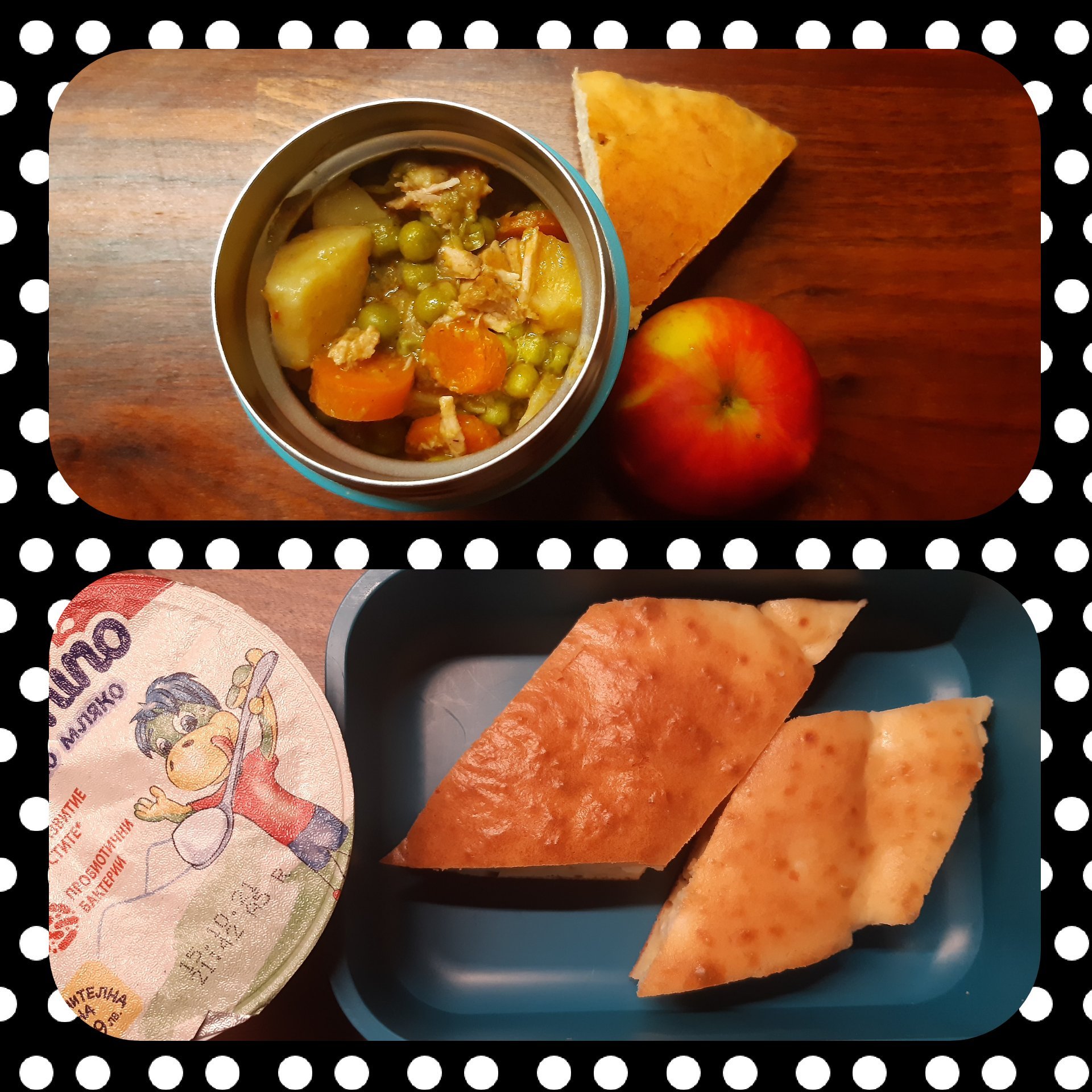 Днес за междучасието – ябълка; кутия със зеленчуци (морков, краставица, чушка).