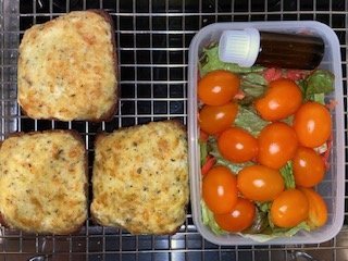 Дъждец, прости печени сандвичи са (разни сирена/кашкавали, яйце, масло, подправки). Изстиват на решетката преди да ги сложа в кутията.