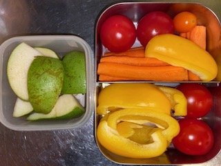 за дребен кифли и ябълка. за едрото също +  сарми и краставица. за ММ остатък от сармите, печено пиле и салата. за мен пиле, салата и домашно кисело мляко.