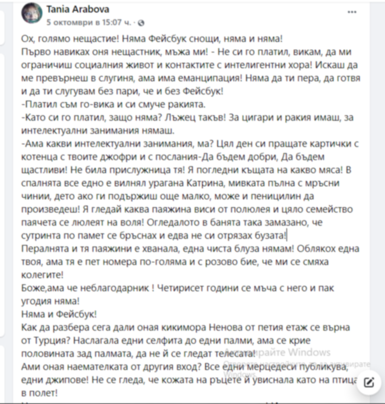 Как да разбера сега дали оная кикимора Ненова от петия етаж се върна от Турция? Наслагала едни селфита до едни палми, ама се крие половината зад палмата, да не й се гледат телесата!