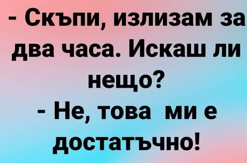 **- Скъпи, знаеш ли? Главоболието, което ме мъчи толкова време, изчезна и сега съм в отлично здраве. Ходих при един хипнотизатор, той ме хипнотизира, накара ме да застана пред огледалото и да си повтарям: "Аз нямам главоболие, аз нямам главоболие, аз нямам главоболие". И о, чудо - то изчезна. Всъщност, знаеш ли? Ти в последно време не си особено страстен в леглото. Защо не отидеш при този човек, може да ти помогне?**