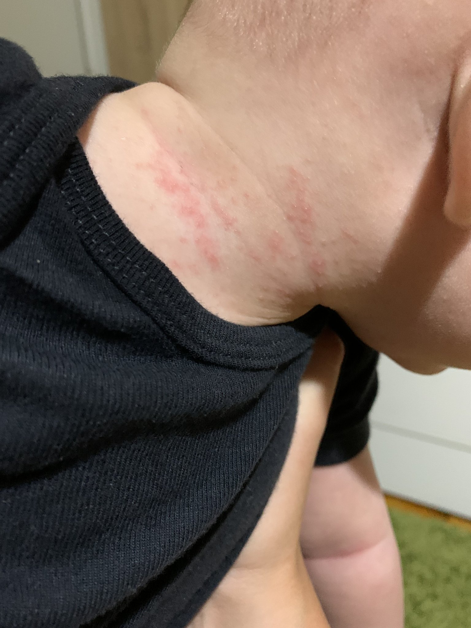 Това излезе на вратлето на сина ми днес сутринта, не беше толкова червено само ситни пъпчици, педиатър каза претопляне. Обрива се разшири и зачерви доста. Не мога да се свържа с педиатъра, моля за мнение с какво мога да намажа за да облекчи…утре веднага отивам! Не е сменяно нищо в менюто му.