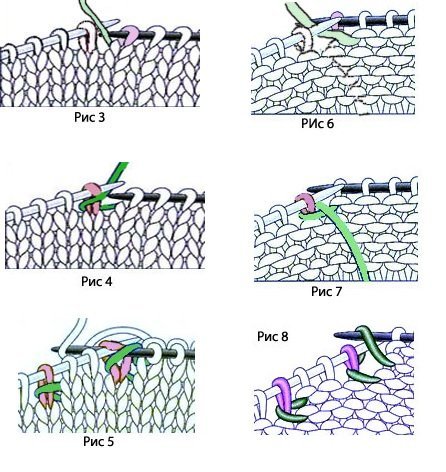 Начин на плетене на скъсени редове за повдигане на гърба, за да не си личи - ляво лицеви, дясно -опакови бримки.