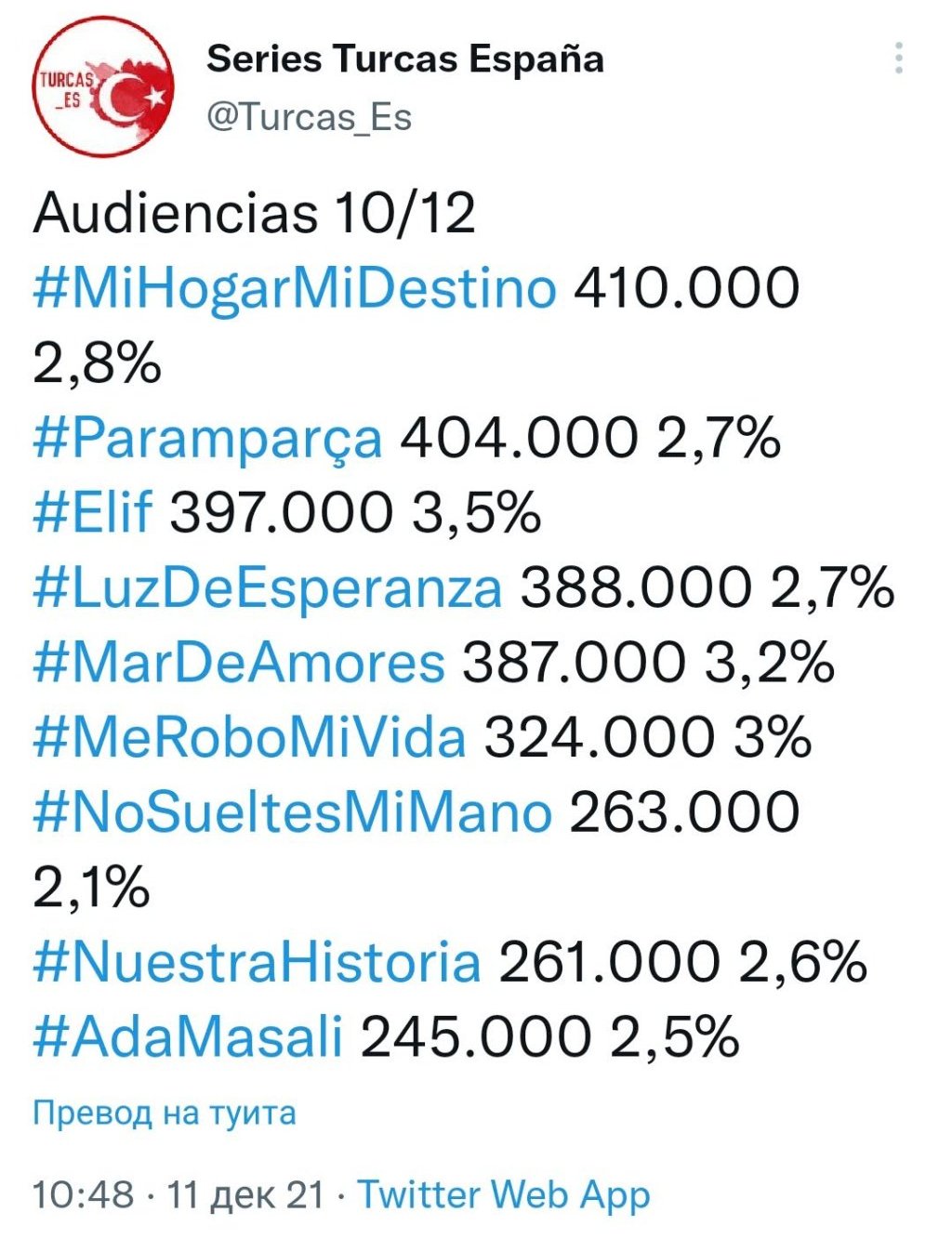 И това, което писах и предишните дни - ДЕК в Испания се котира доста добре. Вчера е бил най-гледаният турски сериал изобщо, не само по Дивинити Kissing Smiling Eyes