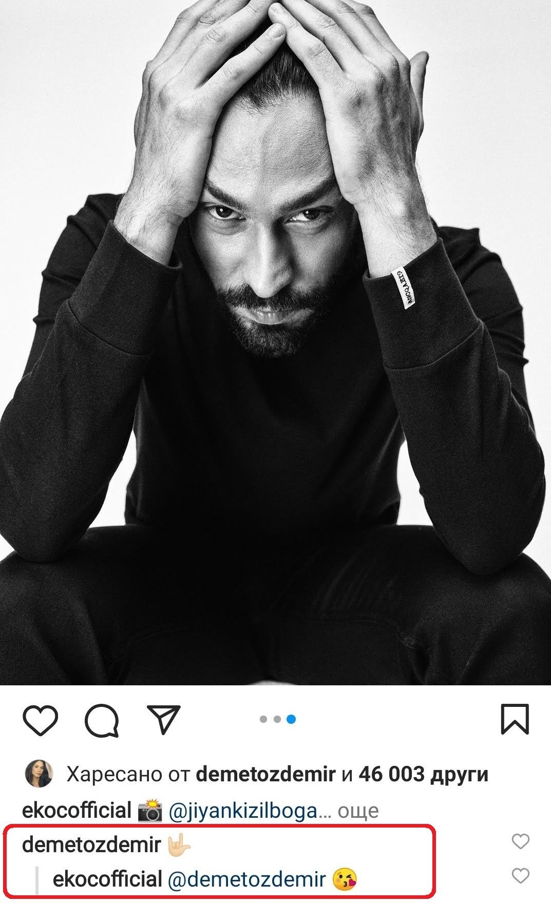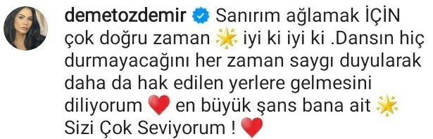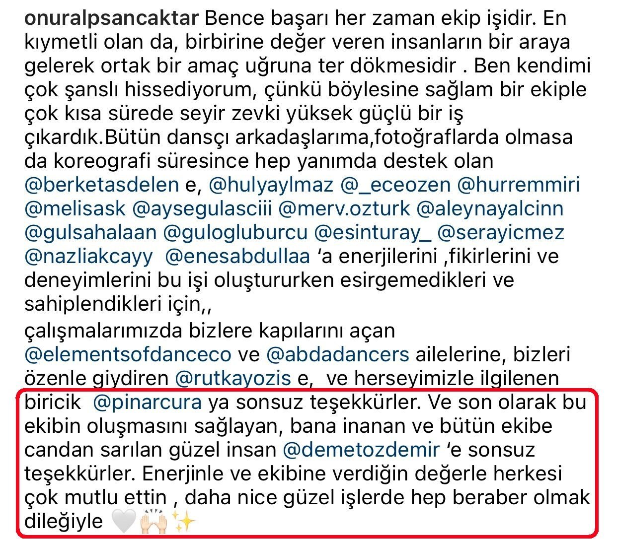 "Мисля, че успехът винаги е бил плод на екипна работа. Най-хубавото е, че хората, които се ценят един друг, се събират и се обединяват около обща цел. Чувствам се голям късметлия, защото с такъв солиден екип свършихме страхотна работа за изключително кратко време. Безкрайни благодарности на всички мои колеги танцьори, които винаги ме подкрепяха по време на хореографията и не щадяха енергията, идеите и опита си, докато създаваха тази творба (изрежда ги поименно), на семействата elementsofdanceo_ и abdadancers_, които отвориха вратите си за нас, на @rutkayozis, че ни облича с грижа, и на единствената pinarcura_, която бдеше за всичко около нас. И накрая, безкрайни благодарности на #DemetÖzdemir, красивия човек, който направи така, че този екип да се събере, повярва в мен и прегърна всички ни. С твоята енергия и цеността, която отдаваш на екипа, направи всички ни много щастливи. Надявам се да бъдем заедно в още много красиви творби".